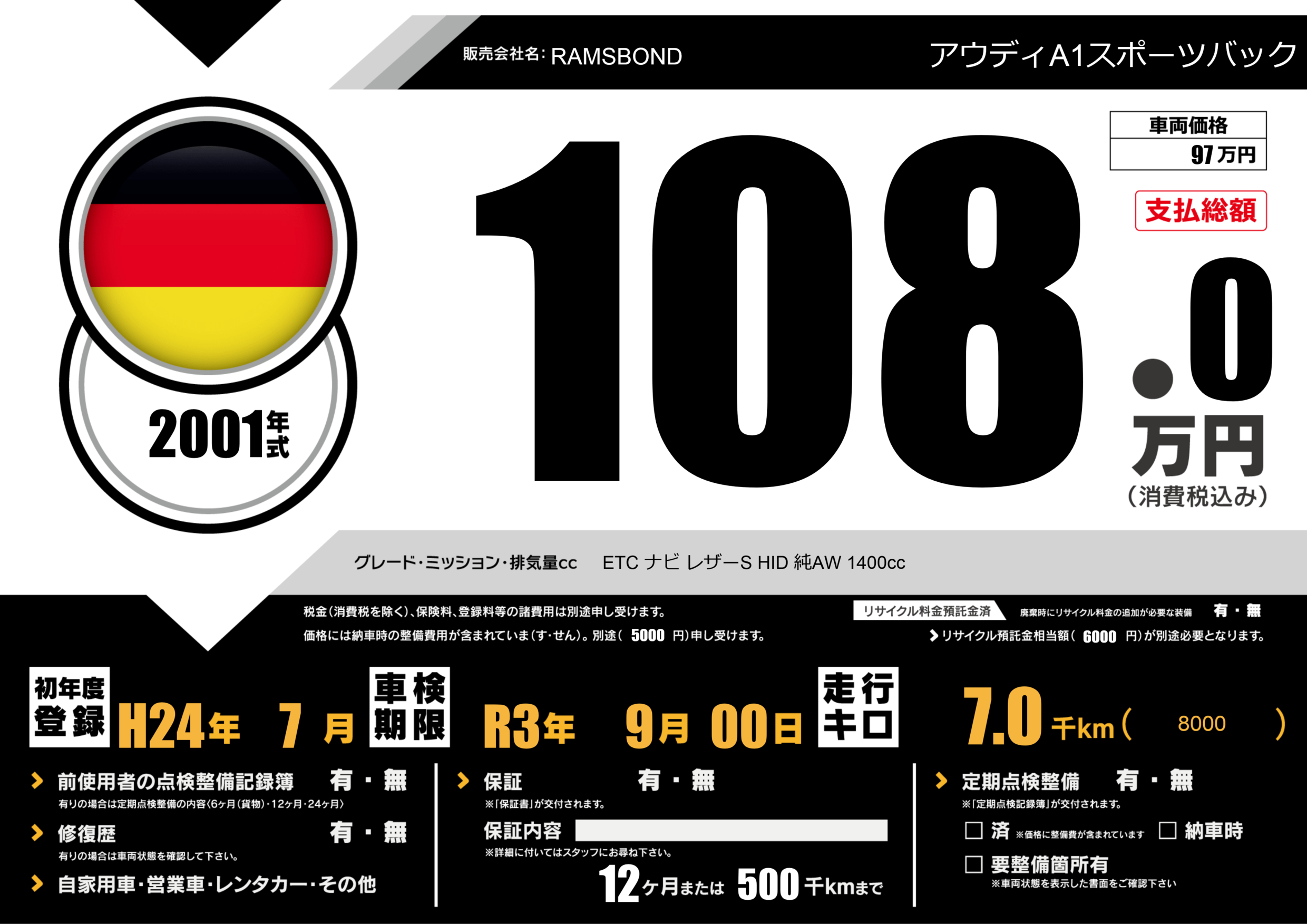 | 車名 | アウディA1スポーツバック | グレード ミッション 排気量 |