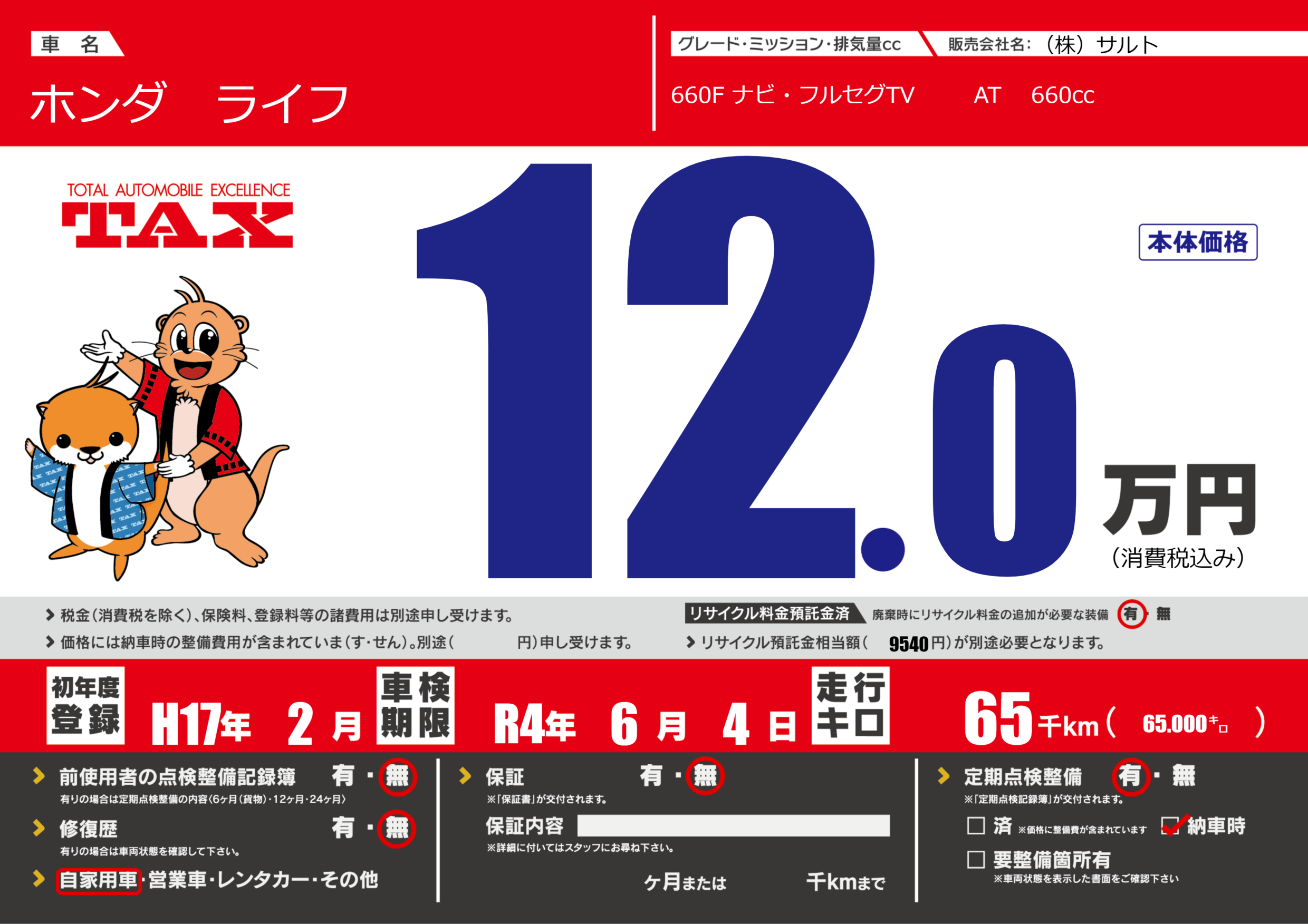 | 車名 | ホンダ ライフ | グレード ミッション 排気量 |