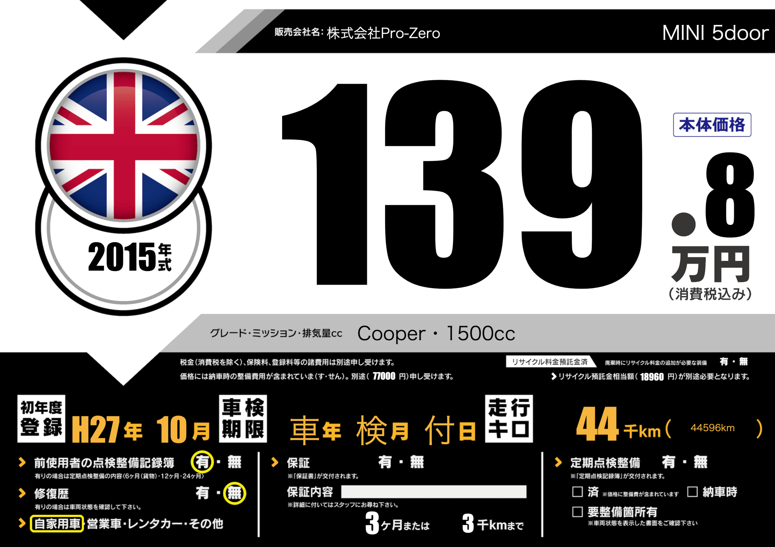 | 車名 | MINI 5door | グレード ミッション 排気量 |