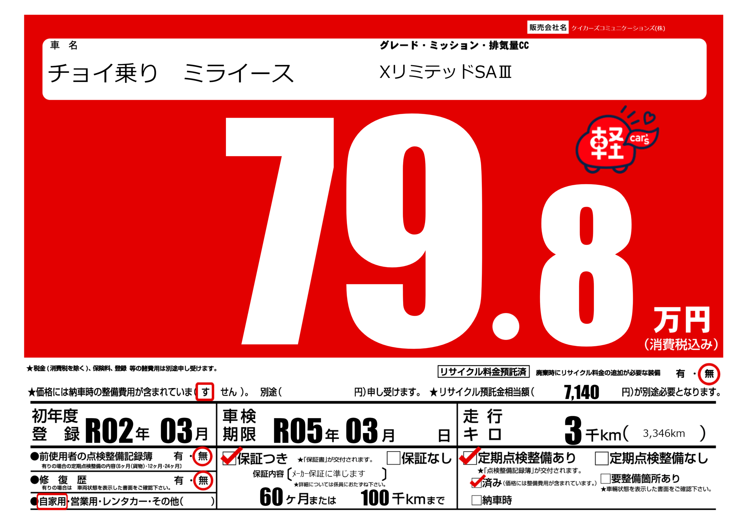 | 定期点検整備 | 定期点検整備あり 定期点検整備済み | ||
