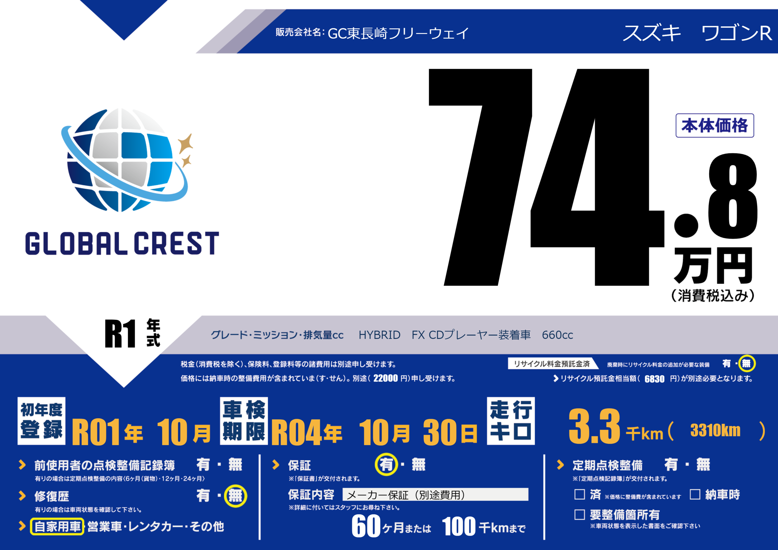 | 走行キロ | 0.3万km | 初年度登録 | R01年10月 |