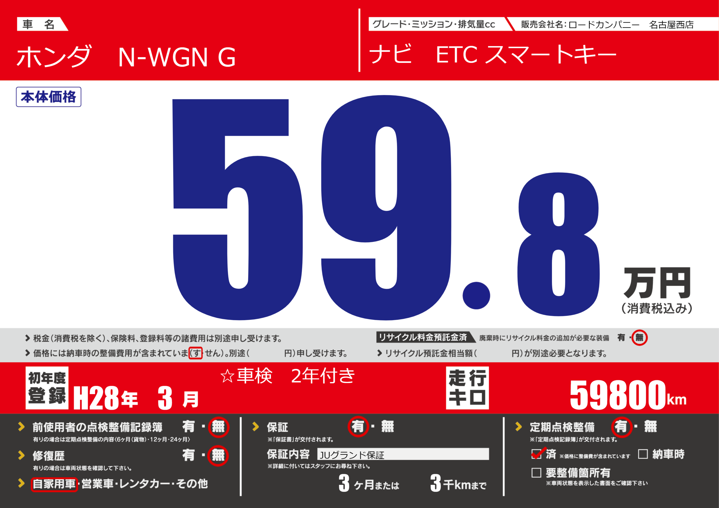 | 車名 | ホンダ N-WGN G | グレード ミッション 排気量 |