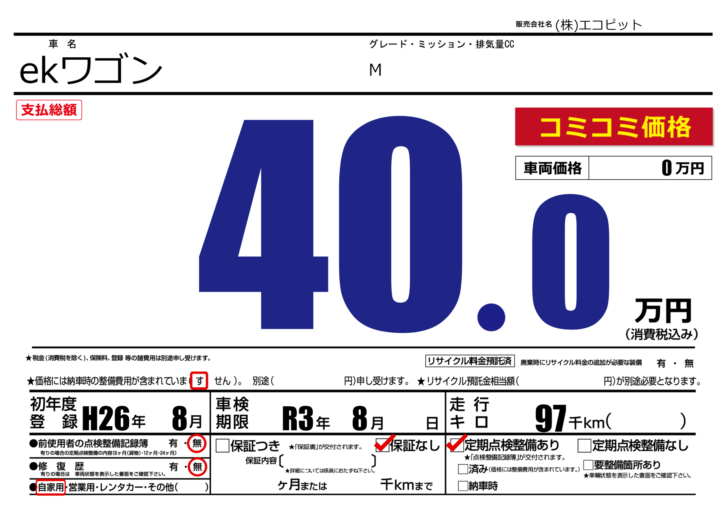 | 車名 | ekワゴン | グレード ミッション 排気量 |