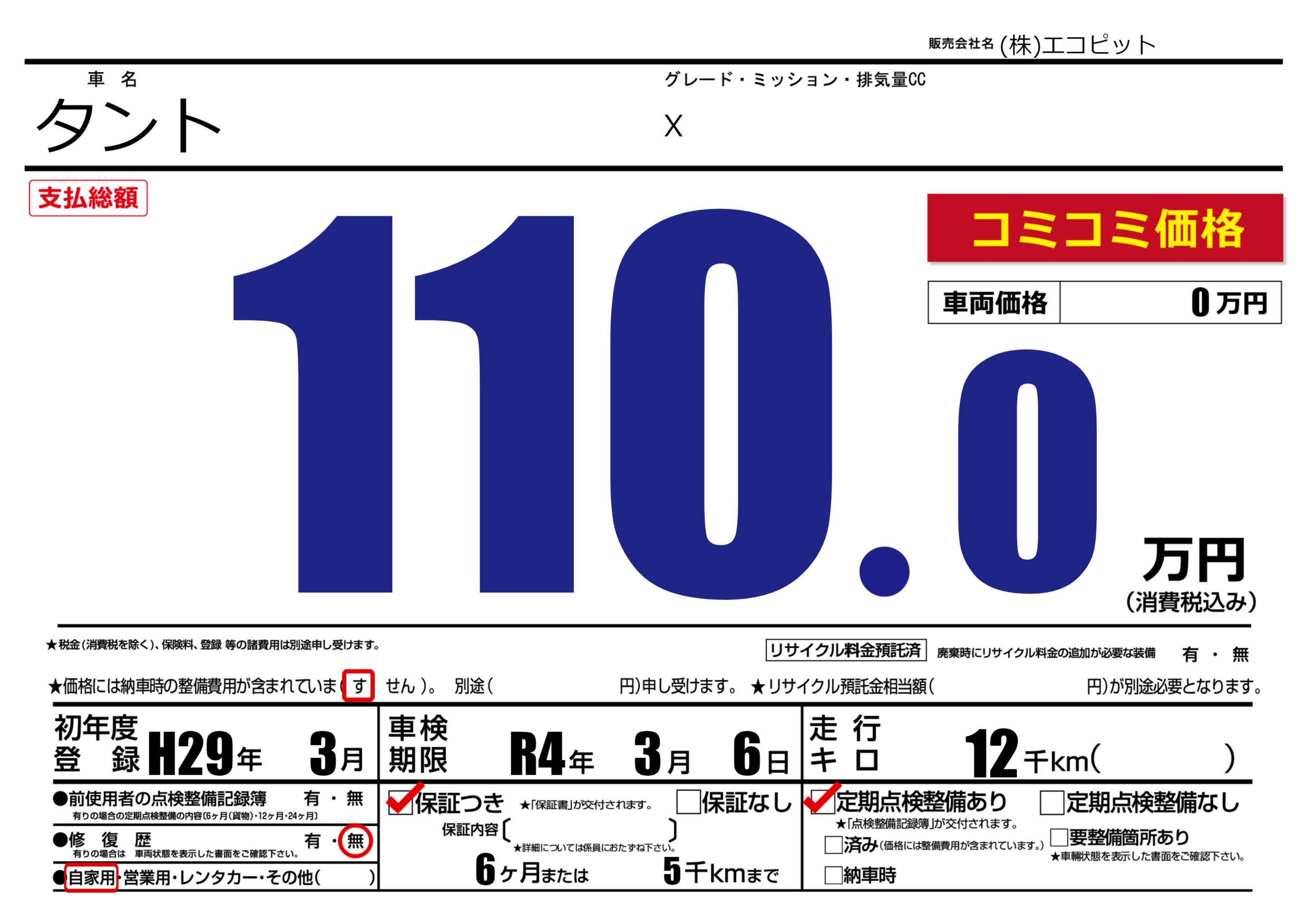 | 車名 | タント | グレード ミッション 排気量 |