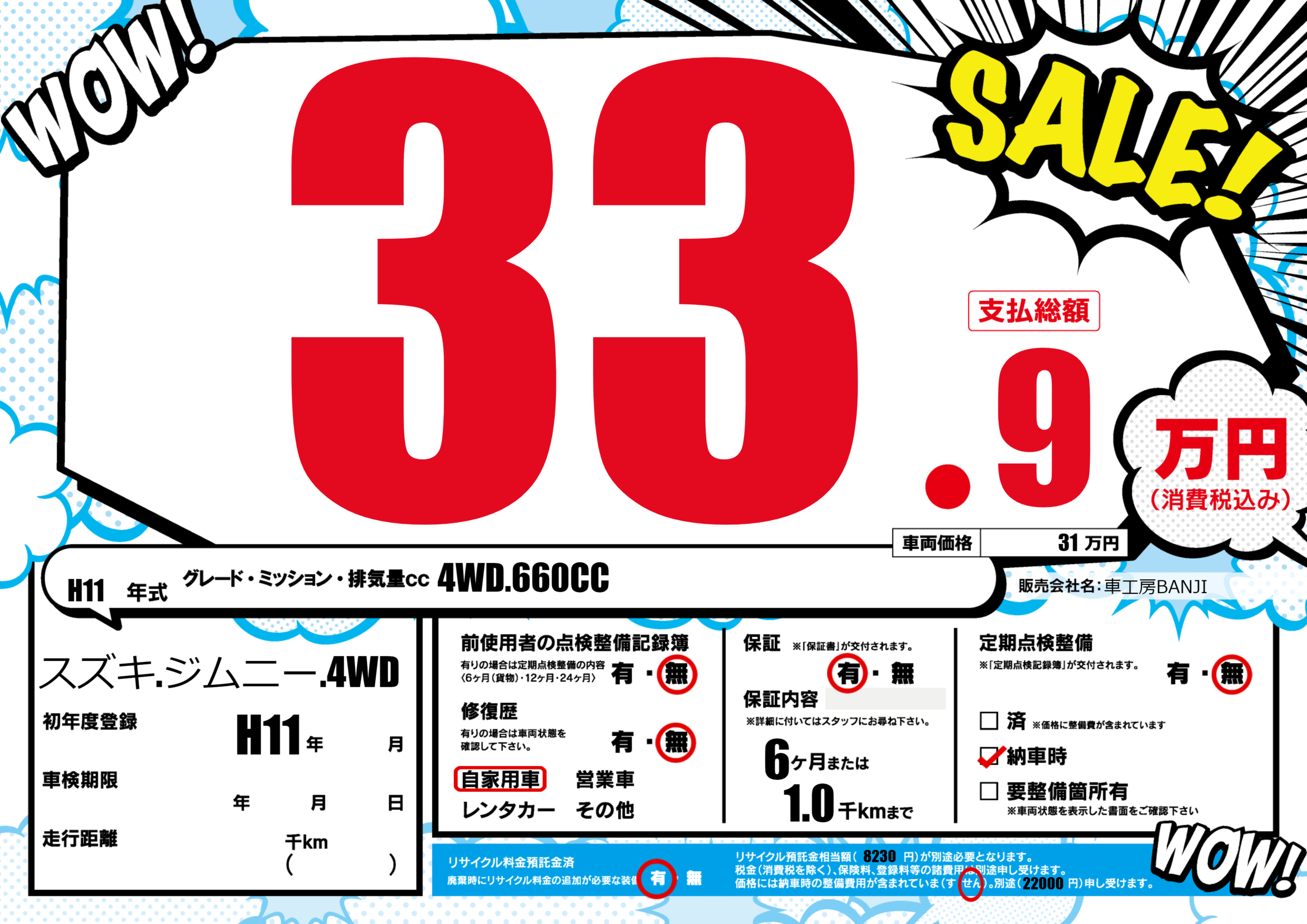| 車名 | スズキ.ジムニー.4WD | グレード ミッション 排気量 |