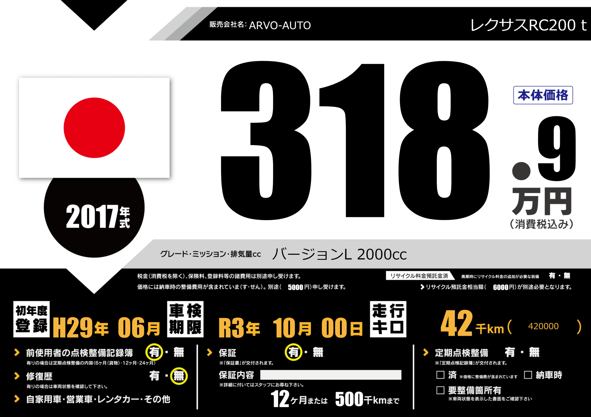 | 車名 | レクサスRC200 t | グレード ミッション 排気量 |