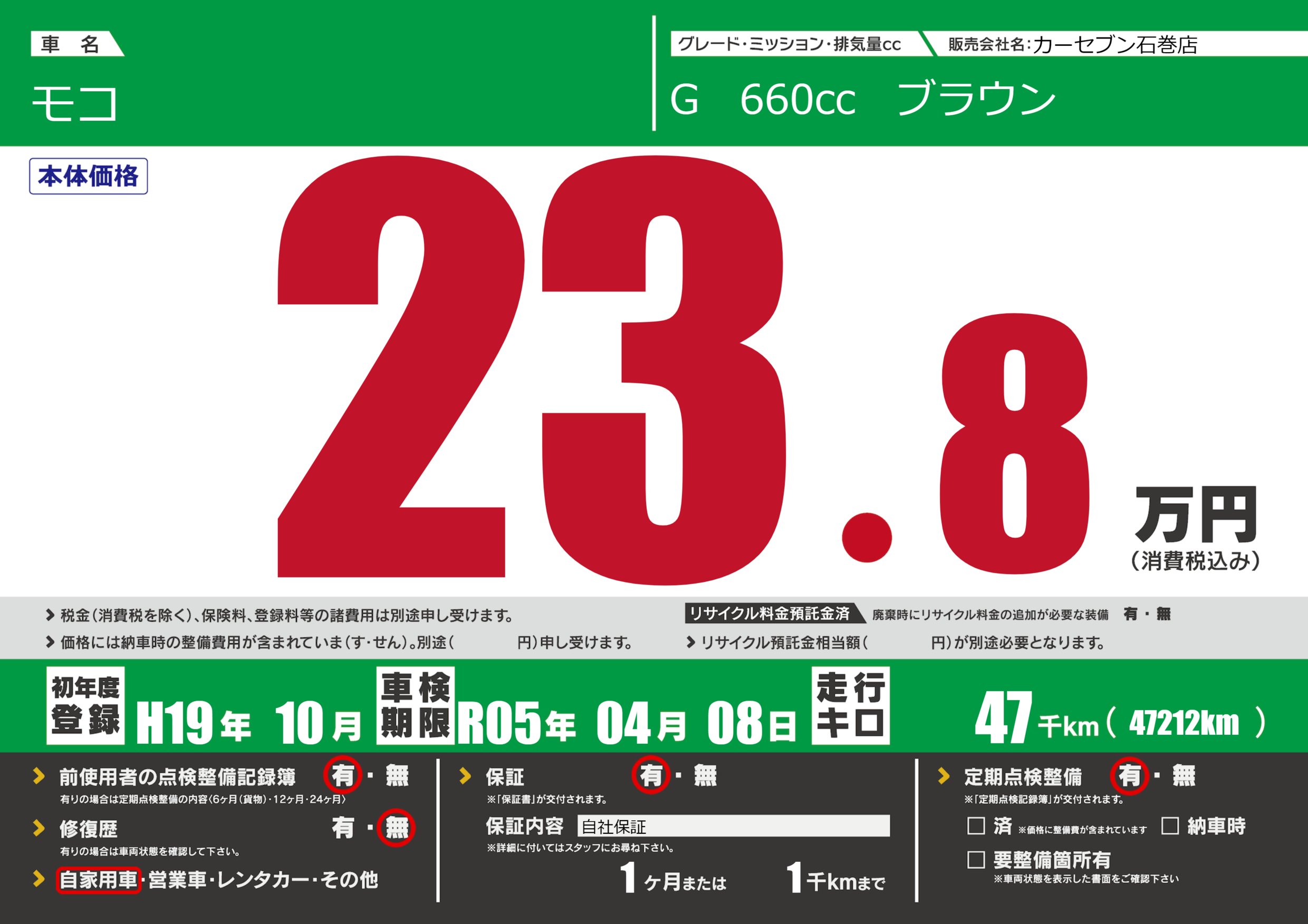 | 走行キロ | 4.7万km | 初年度登録 | H19年10月 |