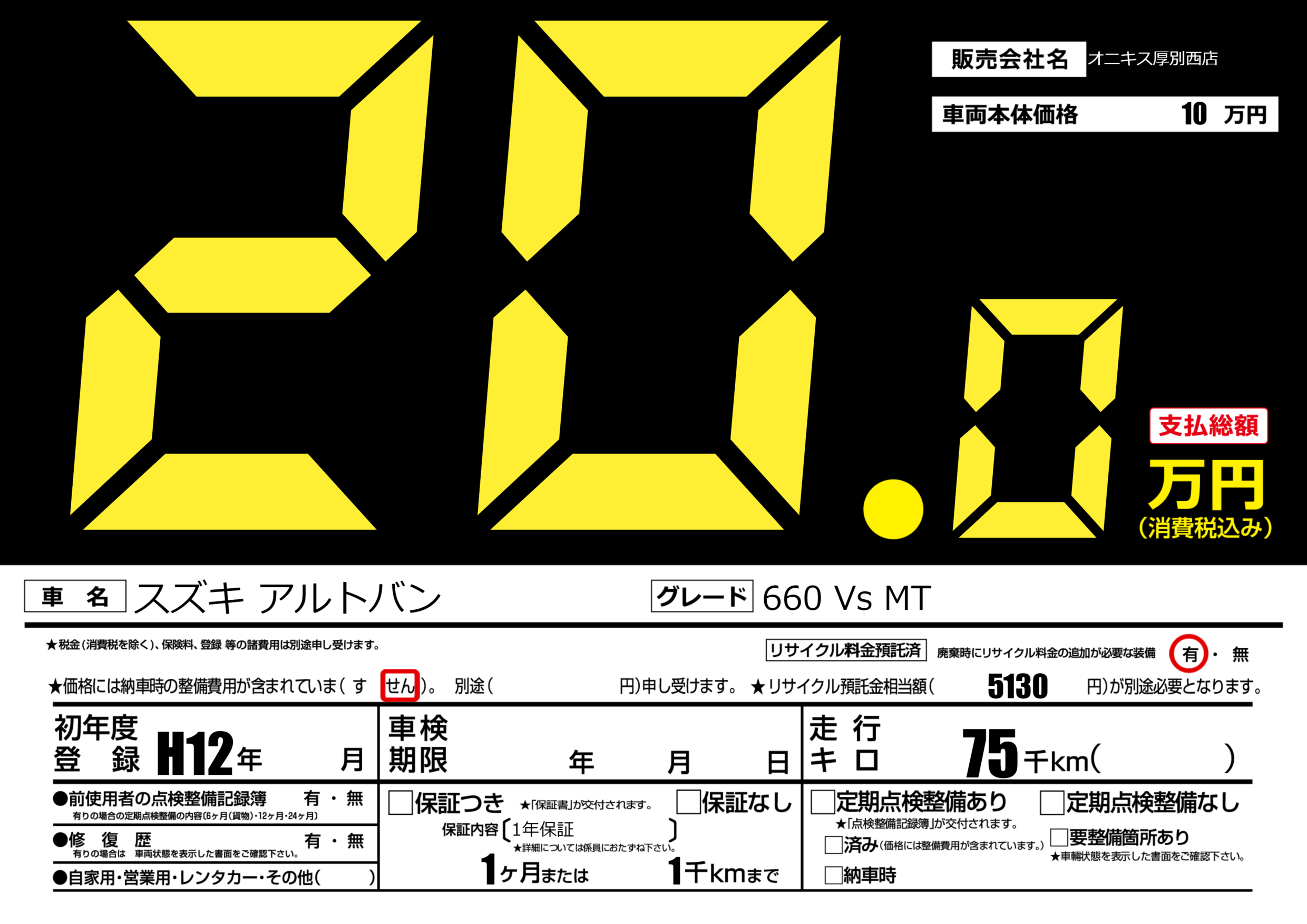 あり | リサイクル預託金相当額 | ( 1円)が別途必要 |