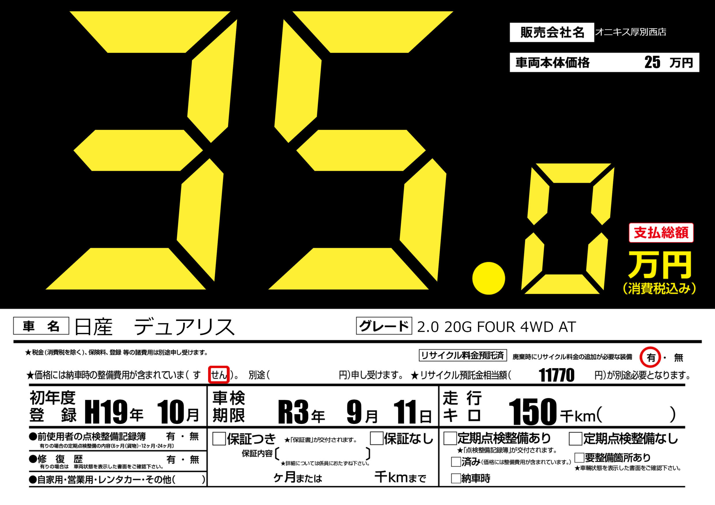 | 走行キロ | 15万km | 初年度登録 | H19年10月 |