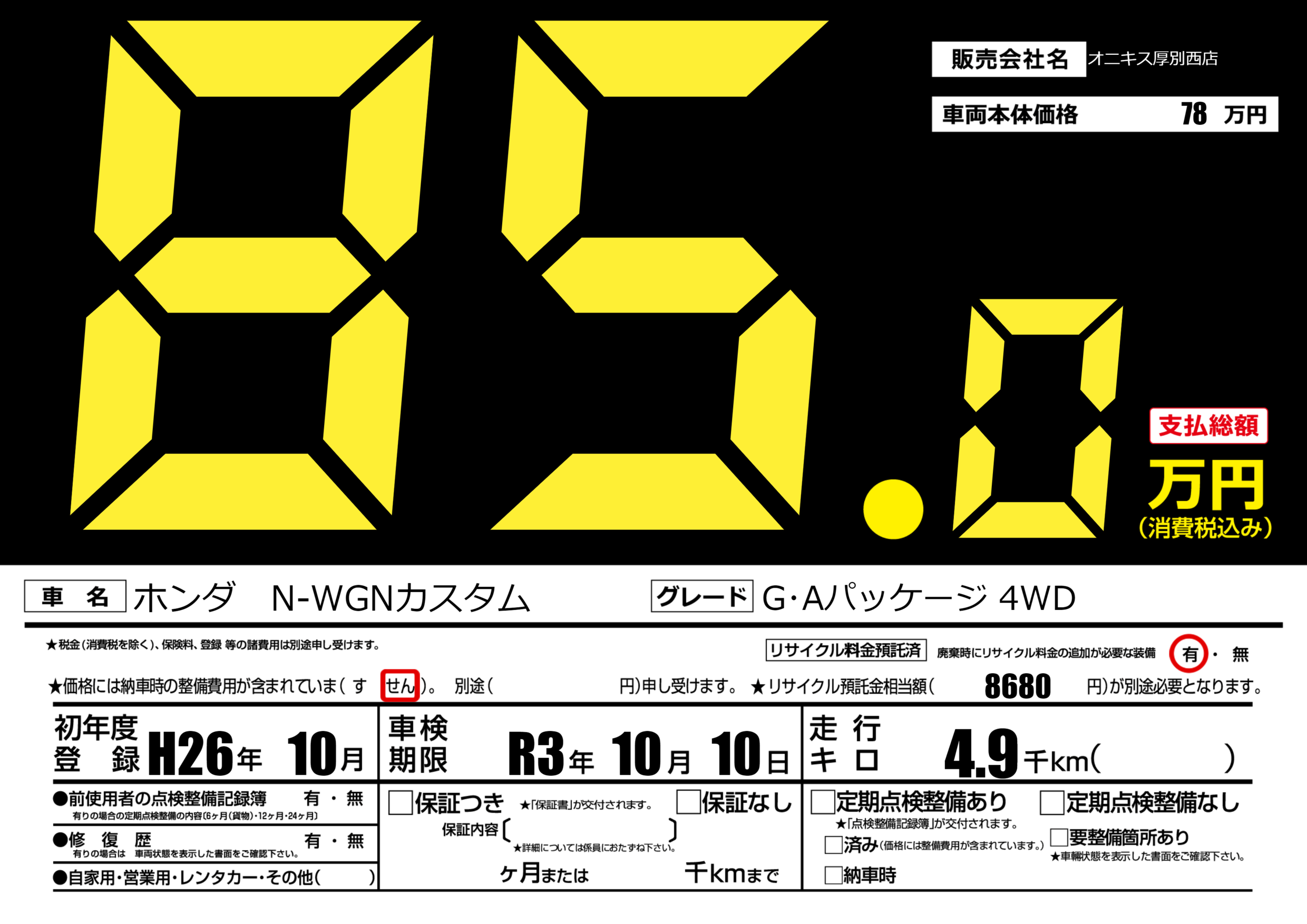 | 走行キロ | 0.4万km | 初年度登録 | H26年10月 |