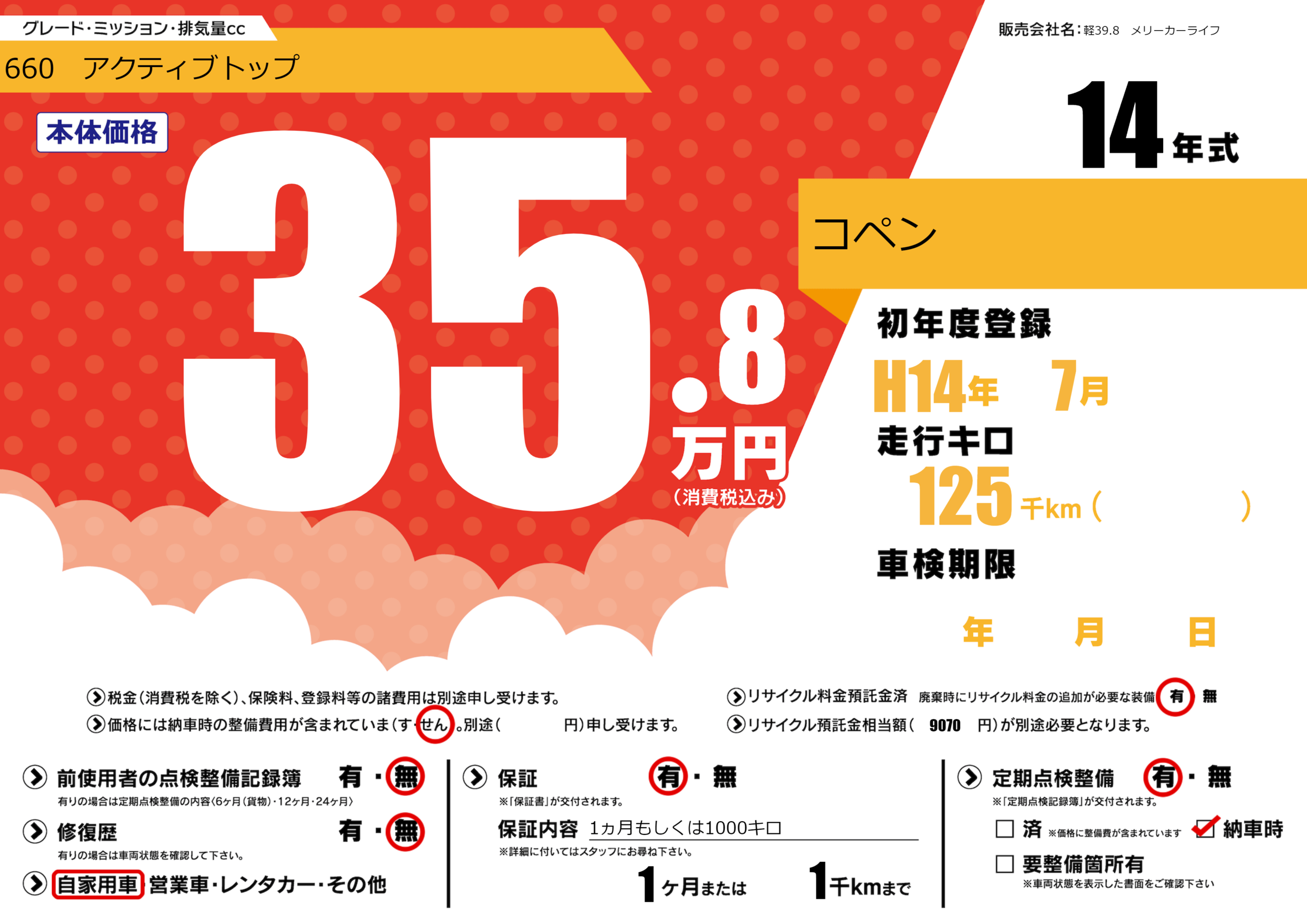 | 定期点検整備 | 定期点検整備あり 納車時あり | ||