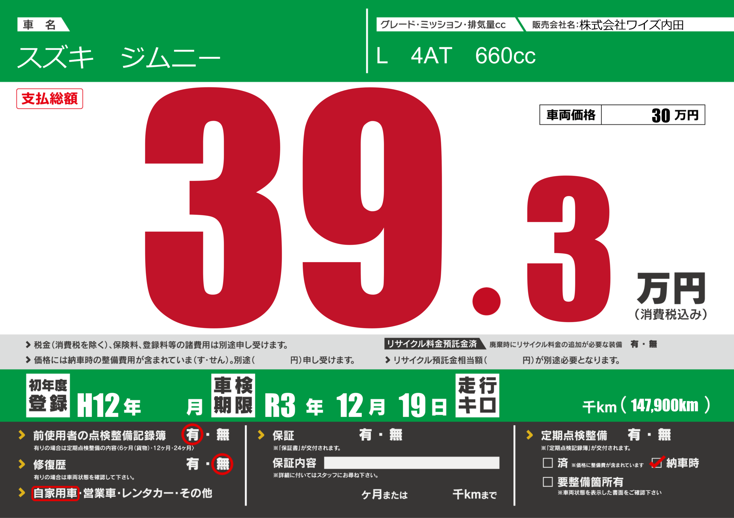 なし | 車検制限 | R3年12月19月 |
