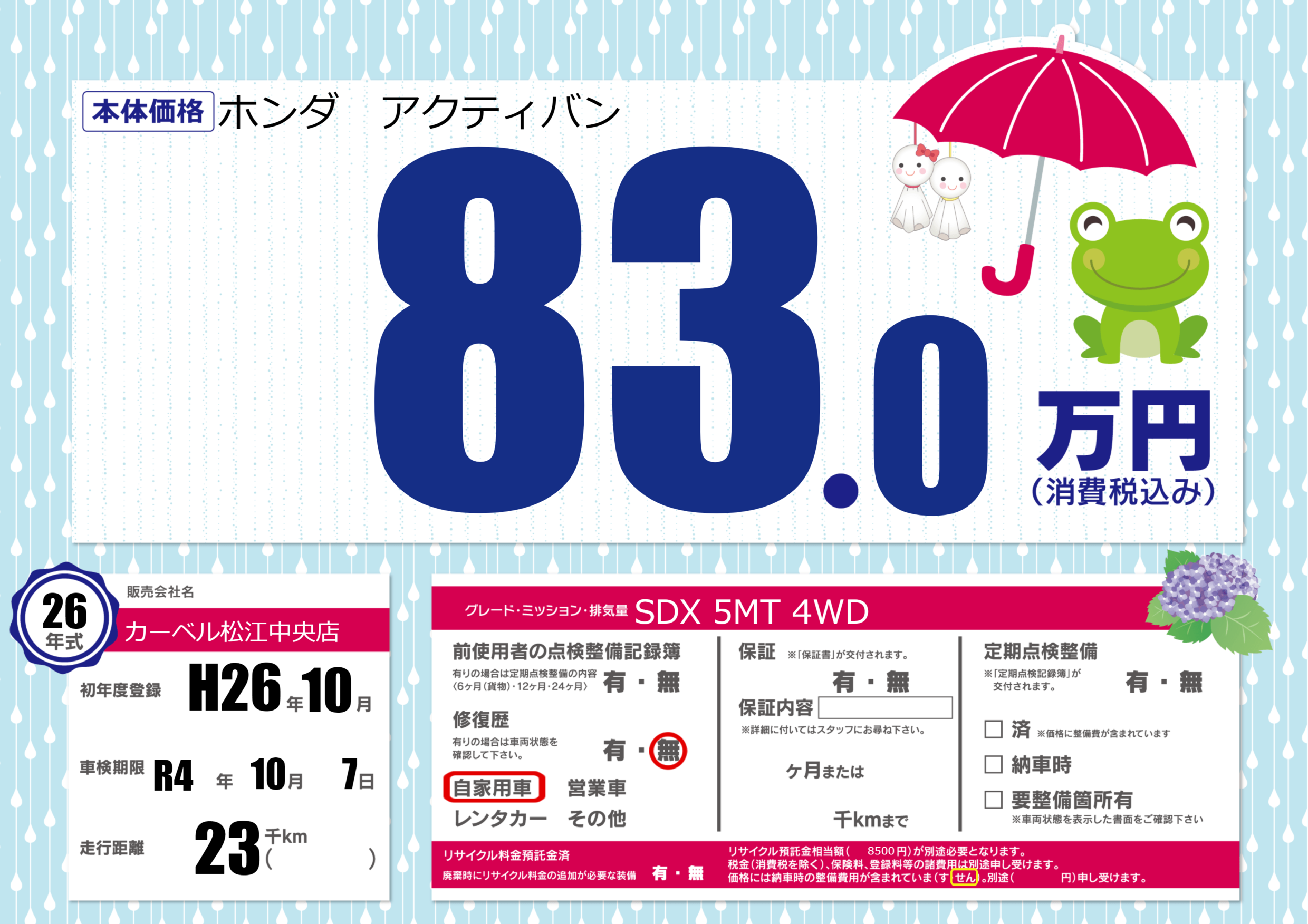 | 車名 | ホンダ アクティバン | グレード ミッション 排気量 |