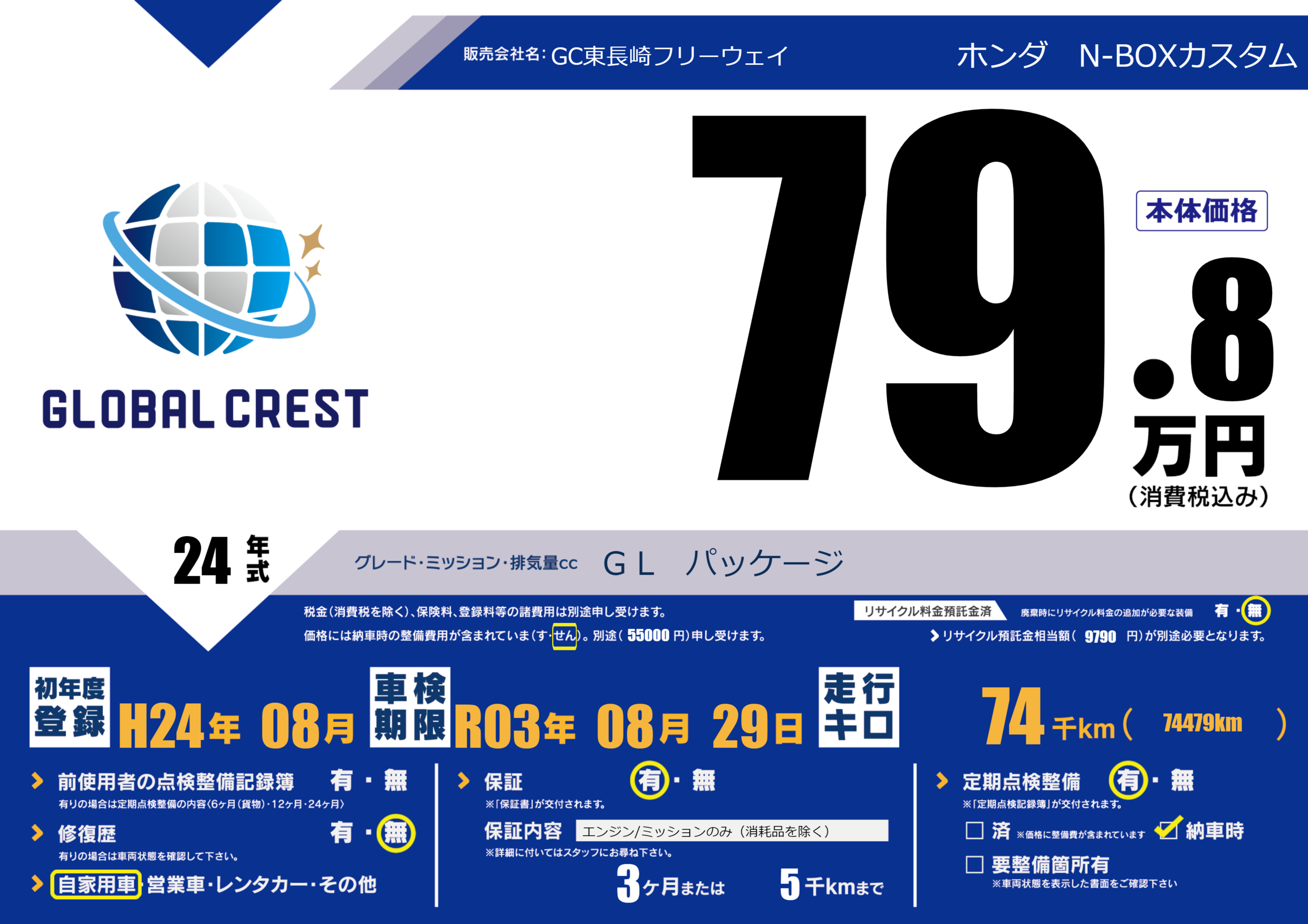 | 車名 | ホンダ N-BOXカスタム | グレード ミッション 排気量 |