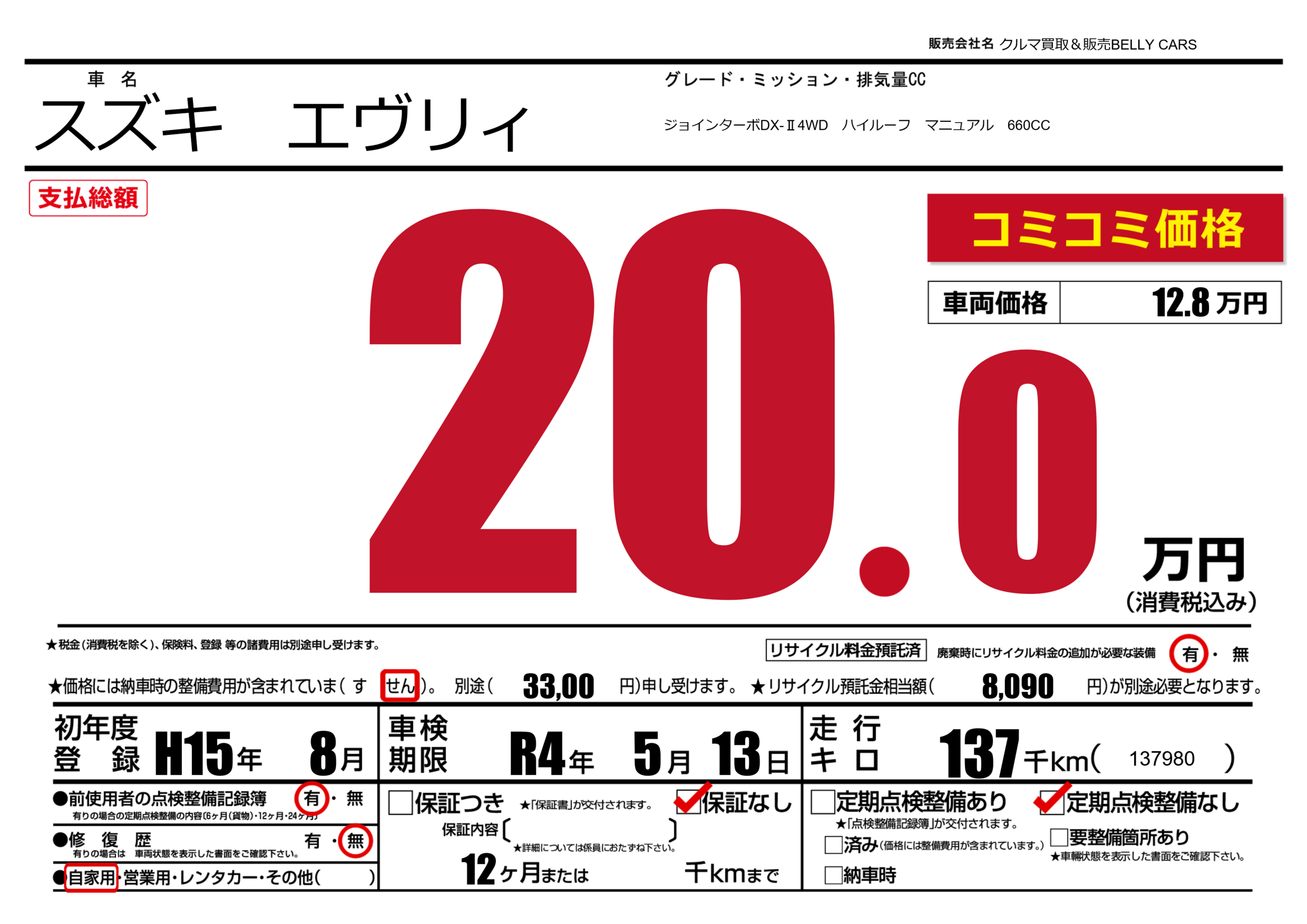 | 車名 | スズキ エヴリィ | グレード ミッション 排気量 |