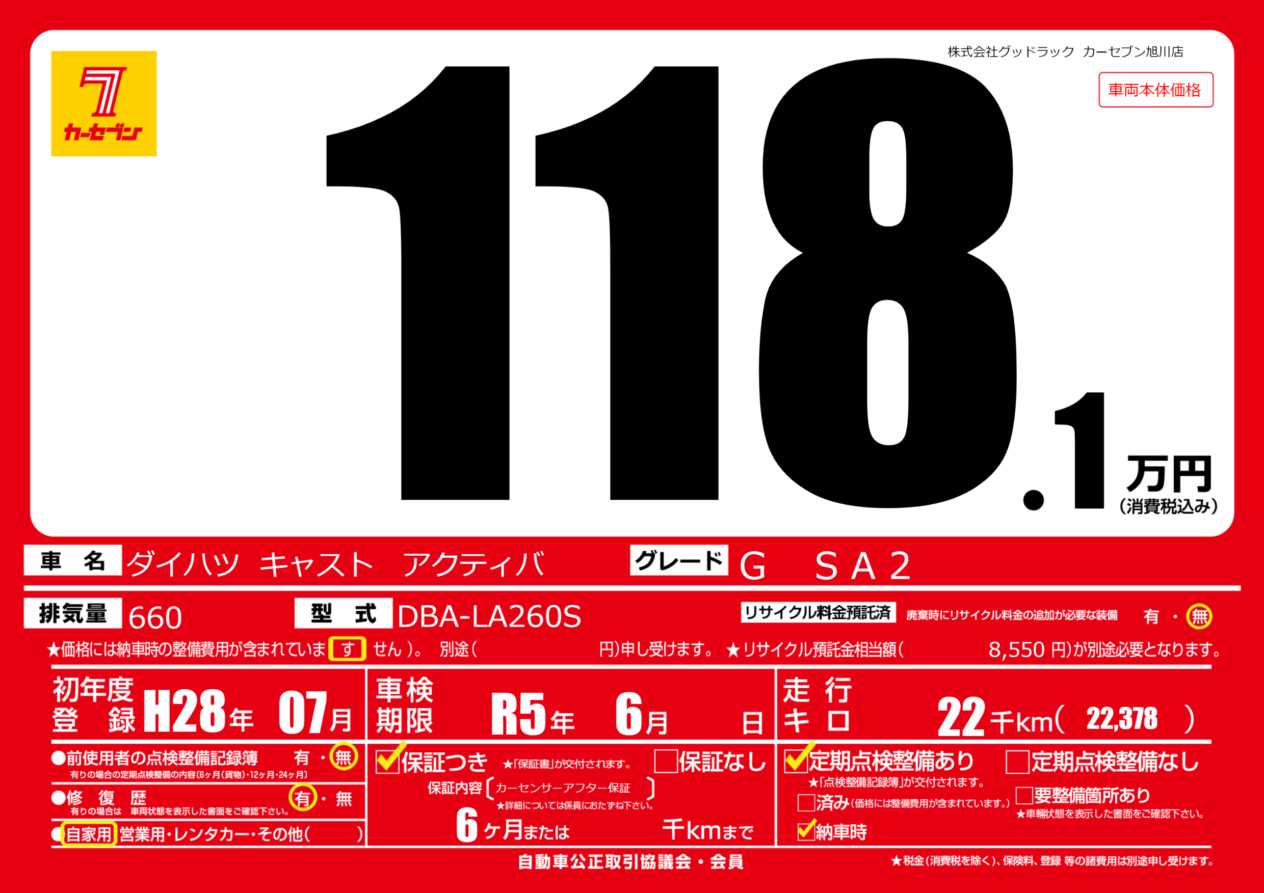 | 車名 | ダイハツ キャスト アクティバ | グレード ミッション 排気量 |