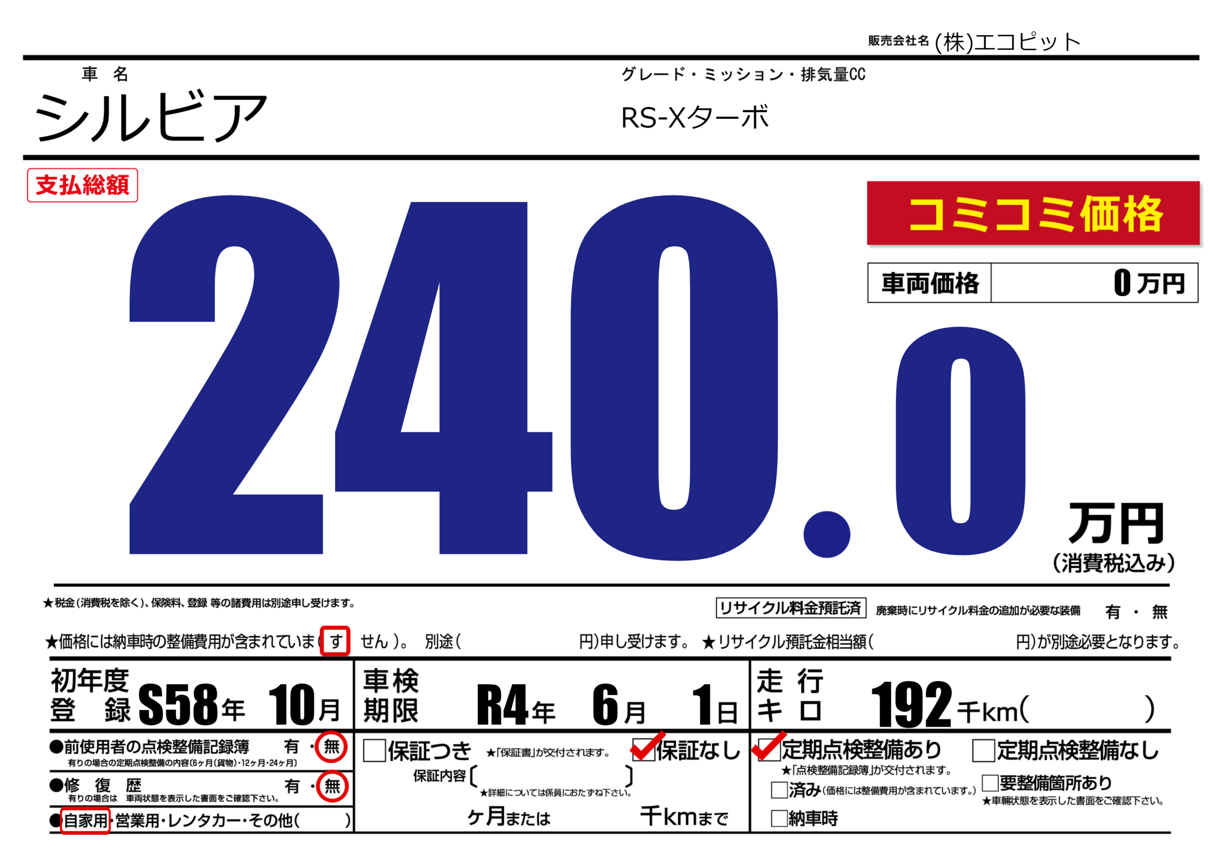 | 車名 | シルビア | グレード ミッション 排気量 |