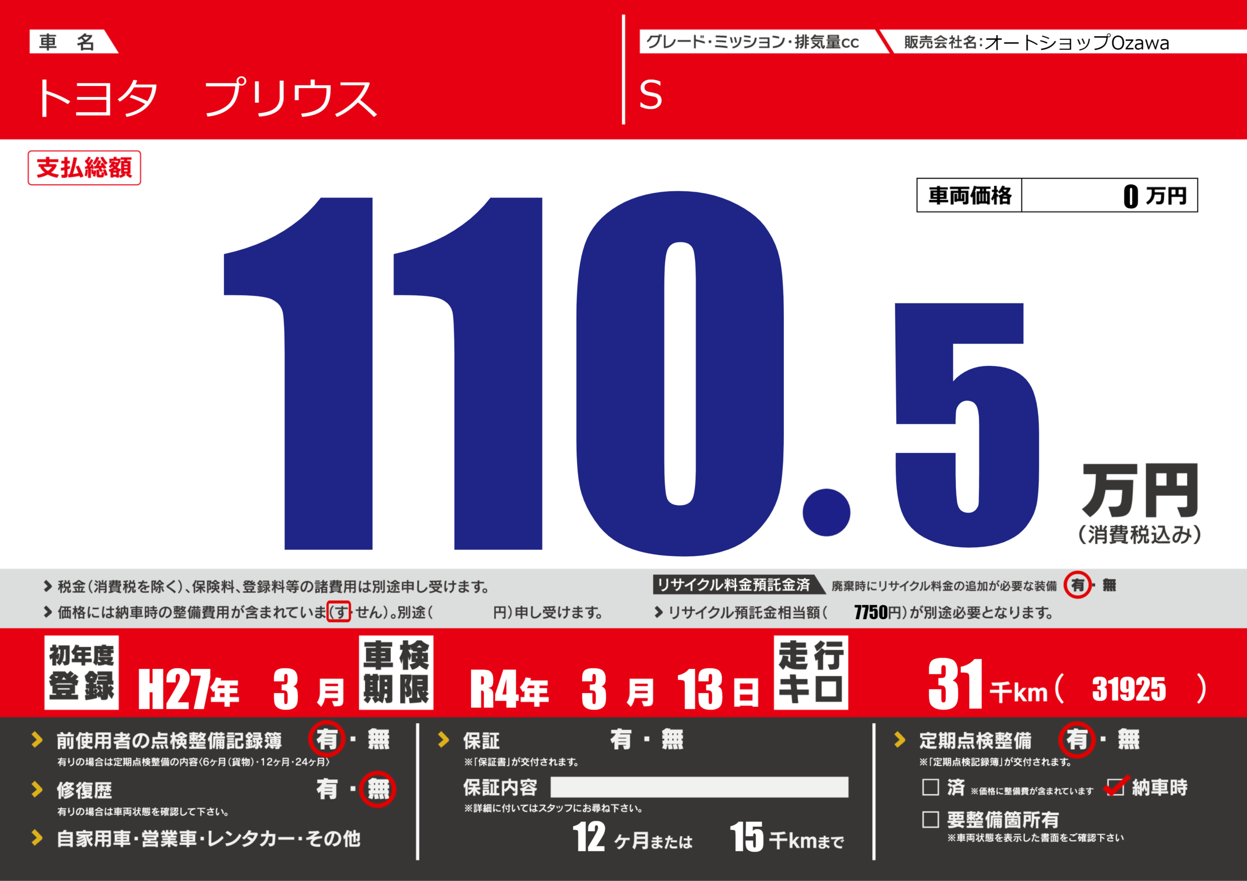 | 定期点検整備 | 定期点検整備あり 納車時あり | ||