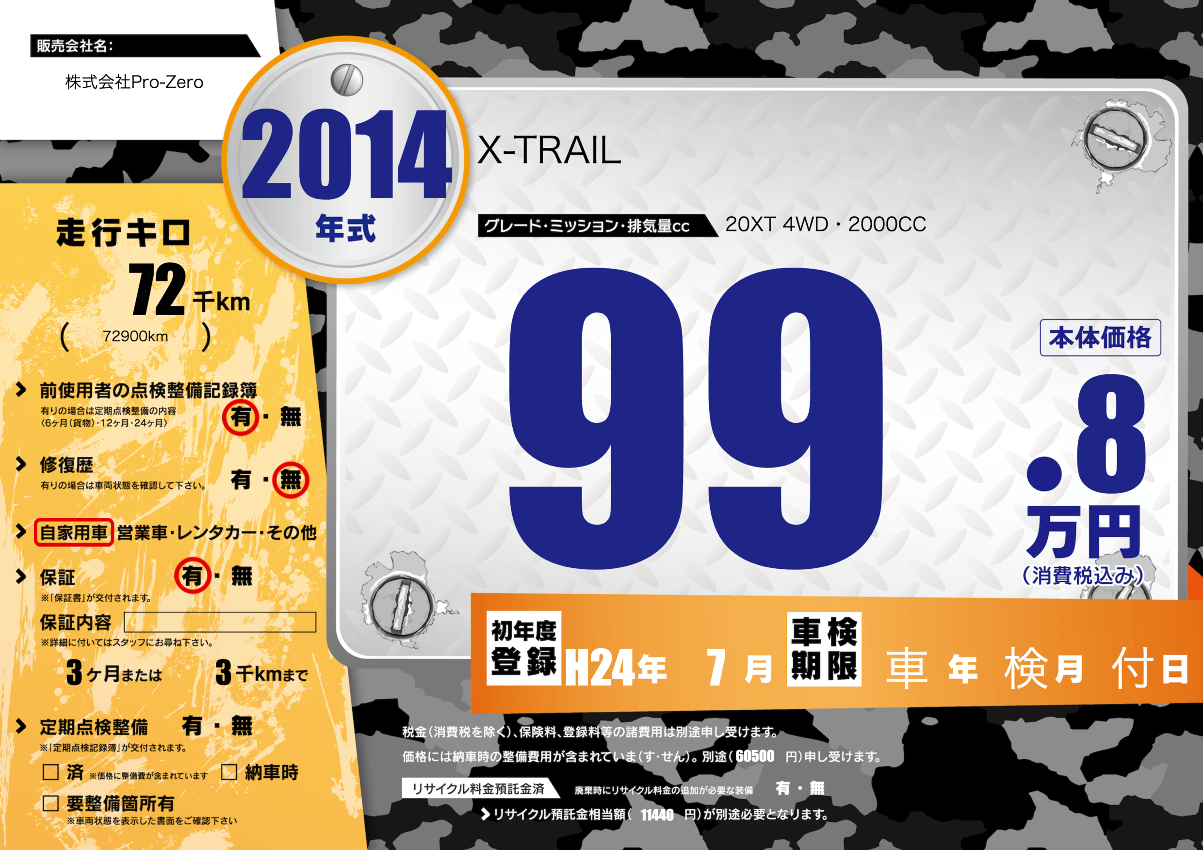 | 走行キロ | 7.2万km | 初年度登録 | H24年7月 |