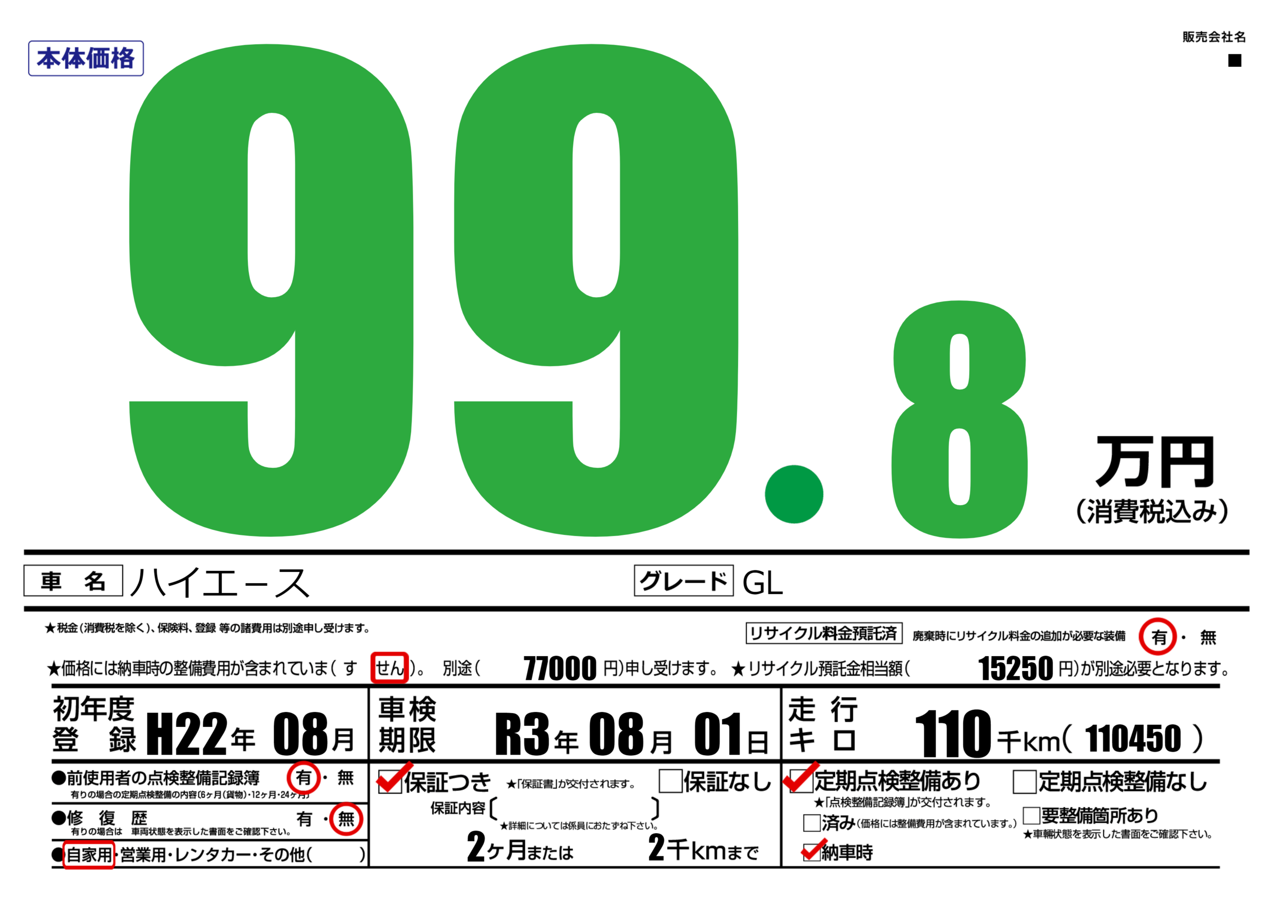 | 定期点検整備 | 定期点検整備あり 納車時あり | ||