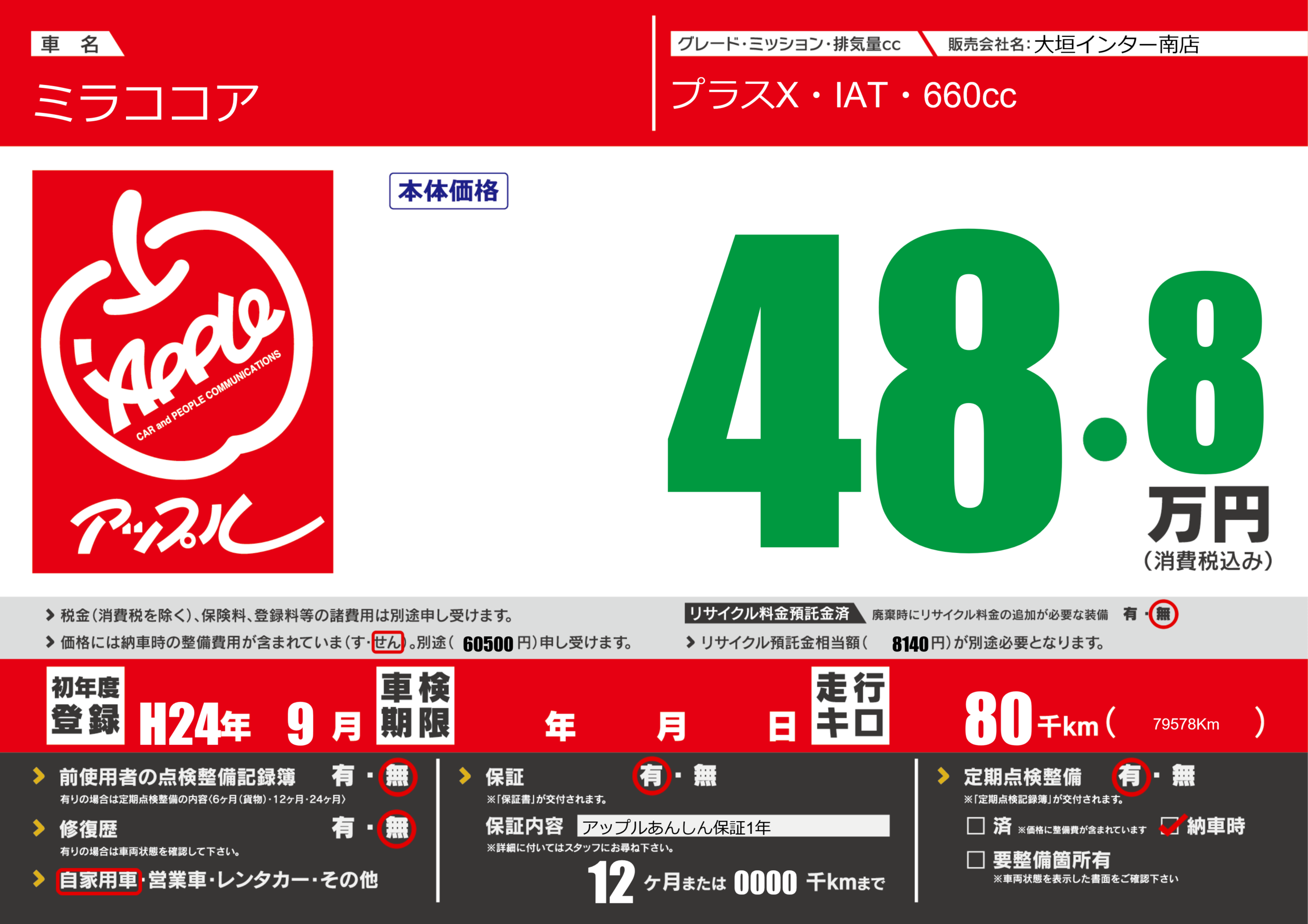 | 車名 | ミラココア | グレード ミッション 排気量 |