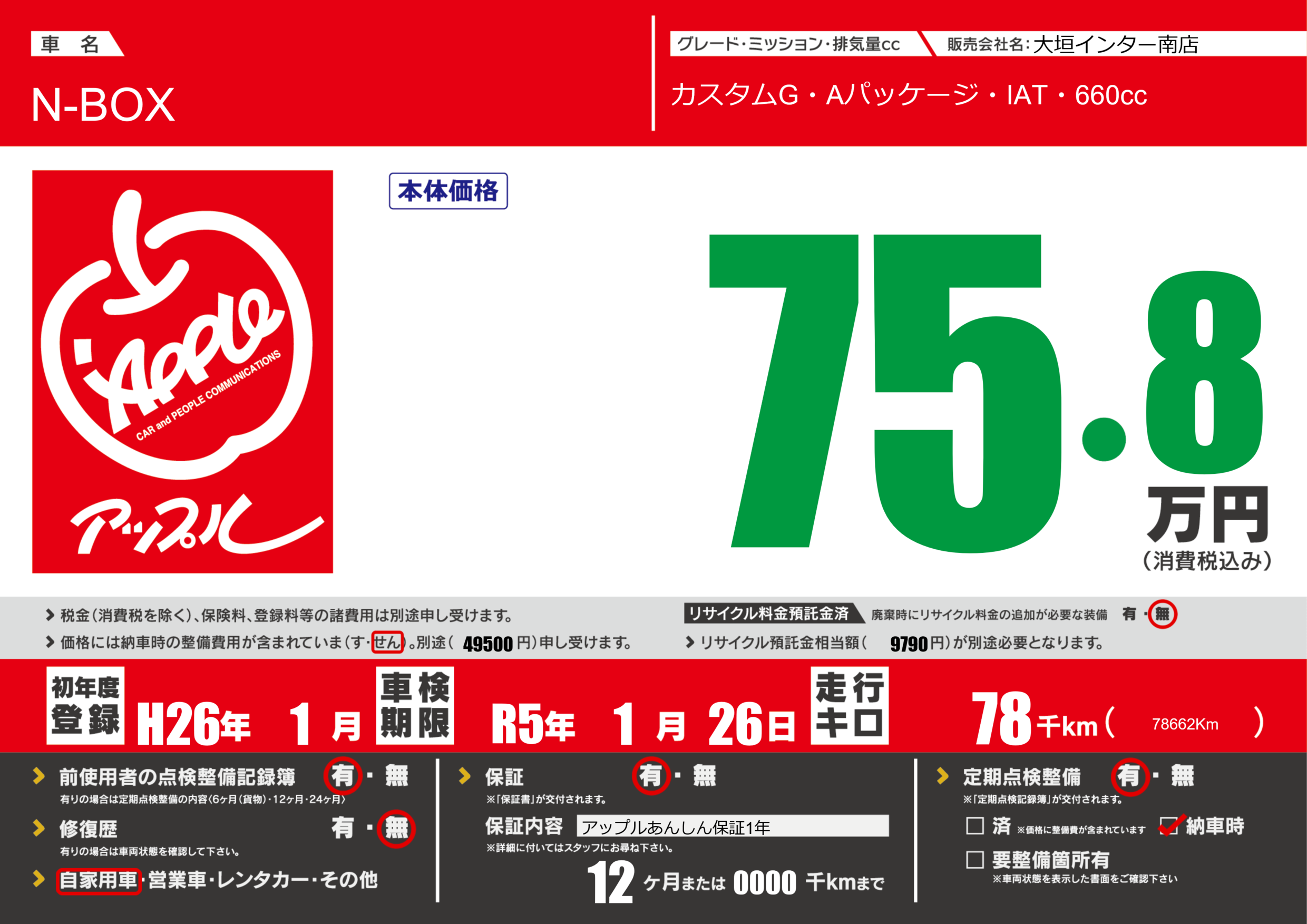| 車名 | N-BOX | グレード ミッション 排気量 |