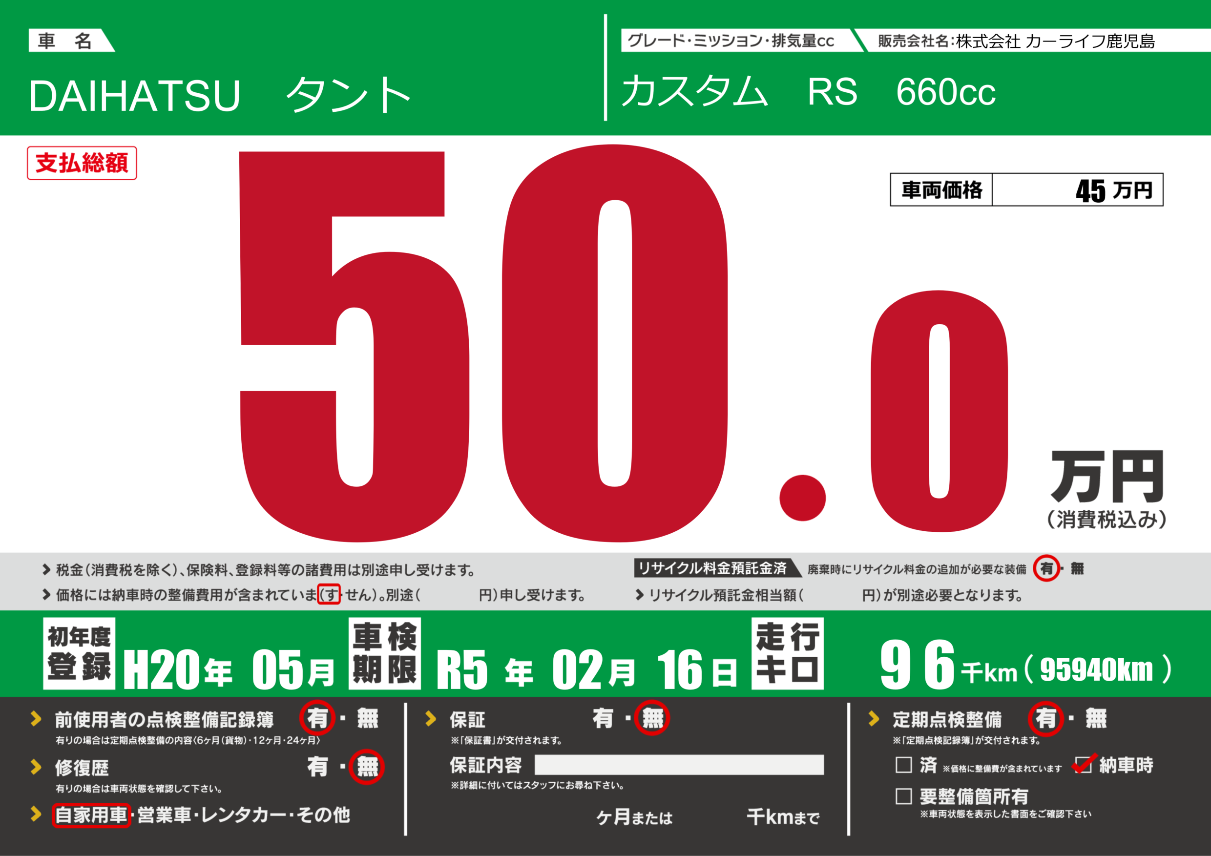 | 車名 | DAIHATSU タント | グレード ミッション 排気量 |