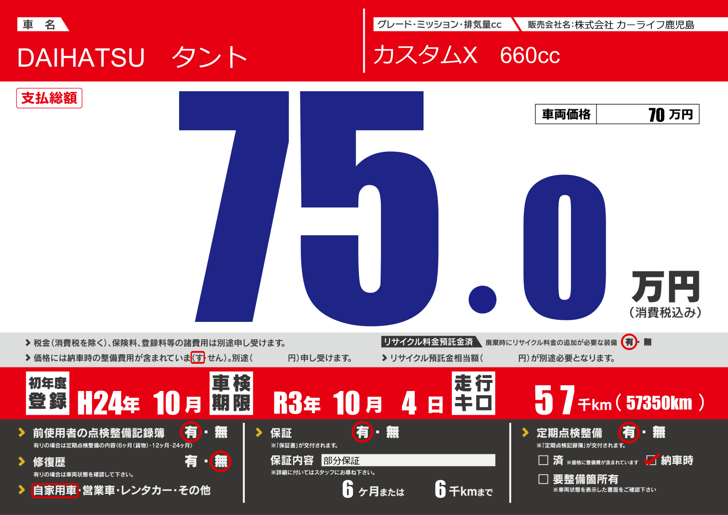 | 車名 | DAIHATSU タント | グレード ミッション 排気量 |