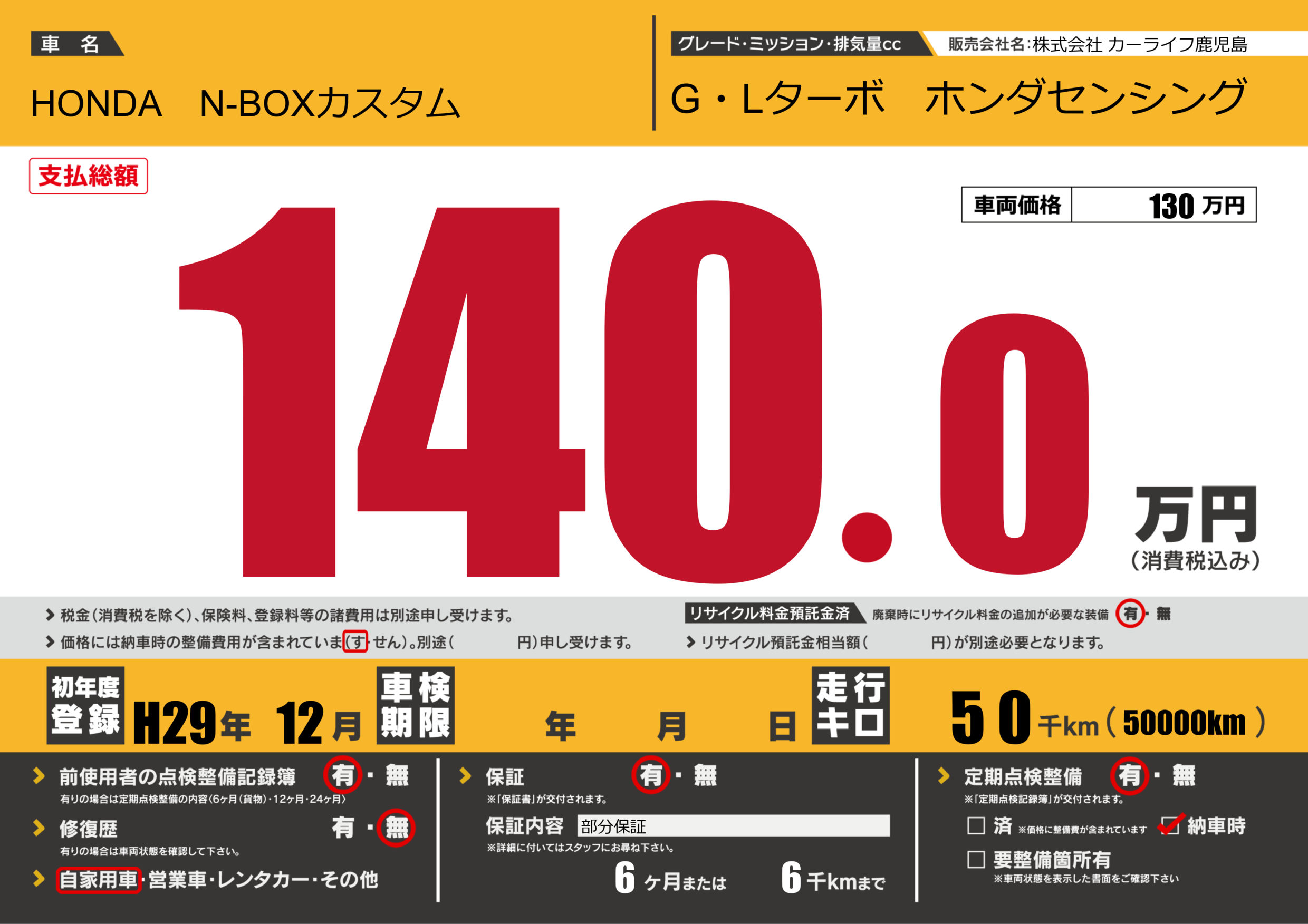 | 定期点検整備 | 定期点検整備あり 納車時あり | ||