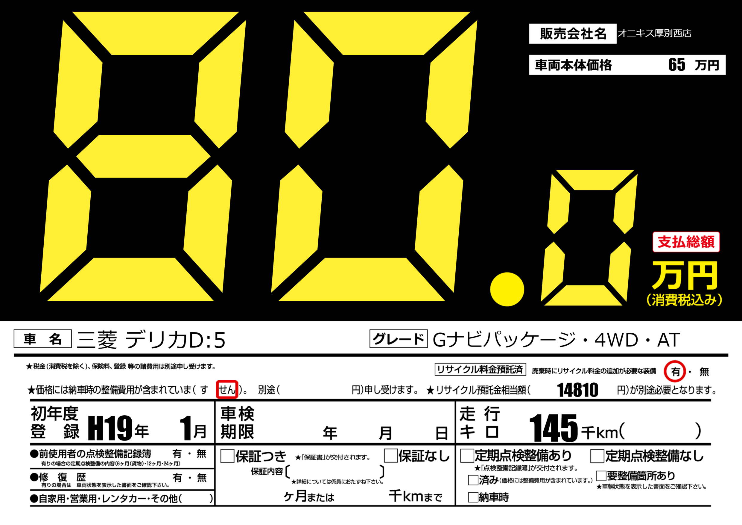 | 走行キロ | 14.5万km | 初年度登録 | H19年1月 |