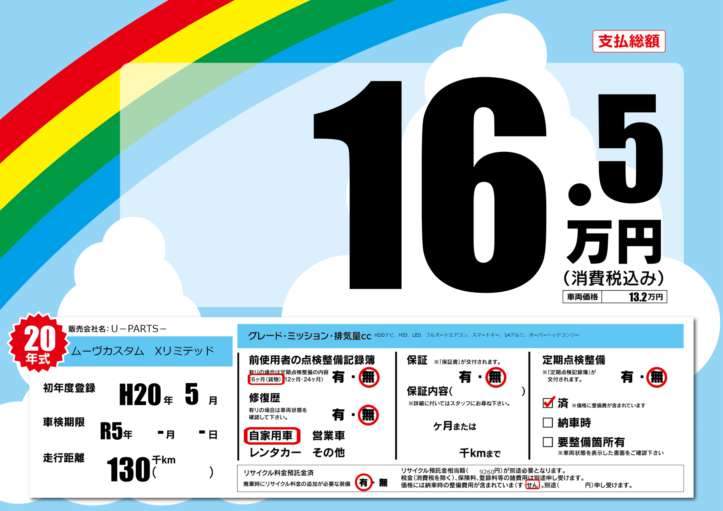 | 走行キロ | 13万km | 初年度登録 | H20年5月 |