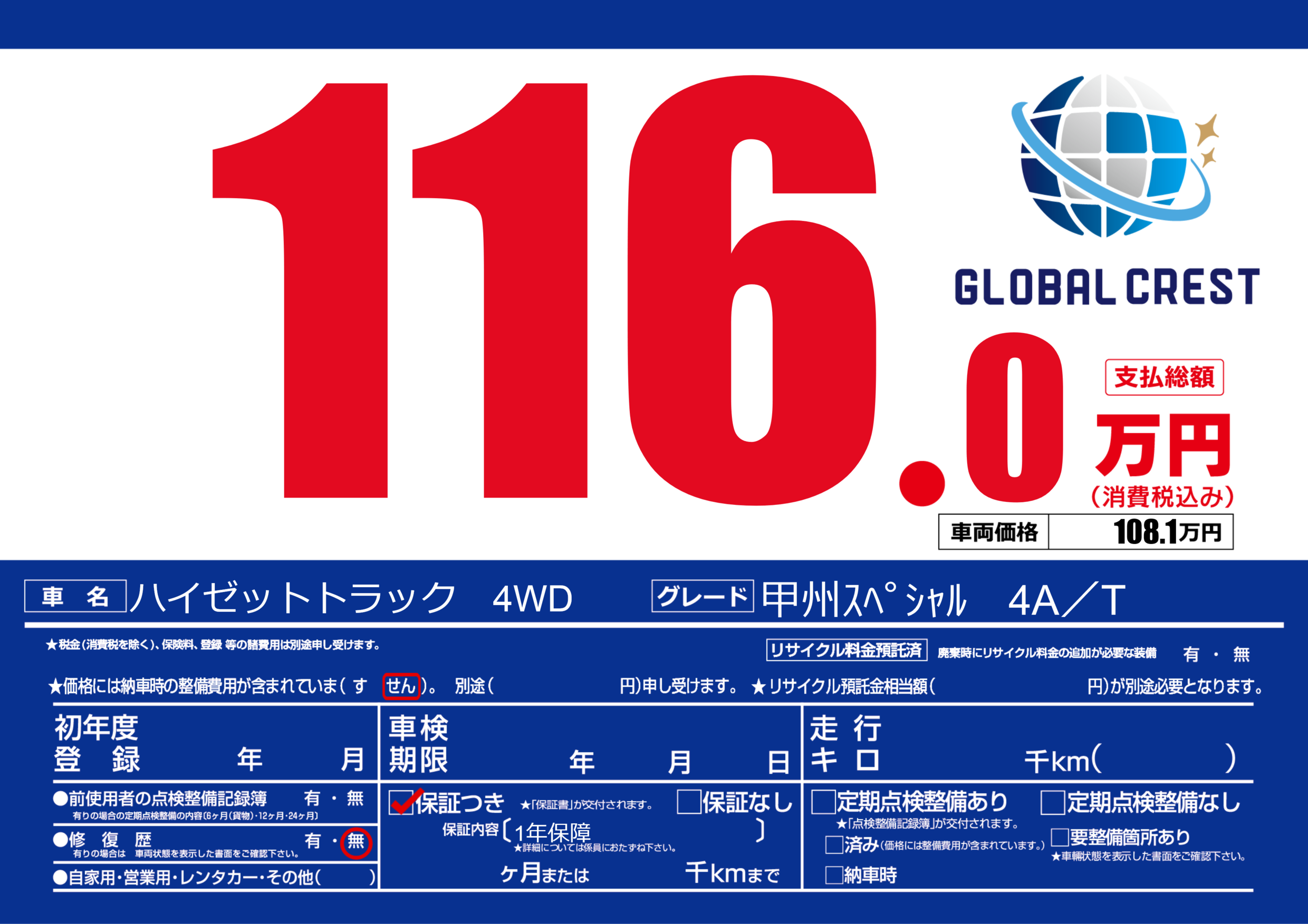 | 車名 | ハイゼットトラック 4WD | グレード ミッション 排気量 |