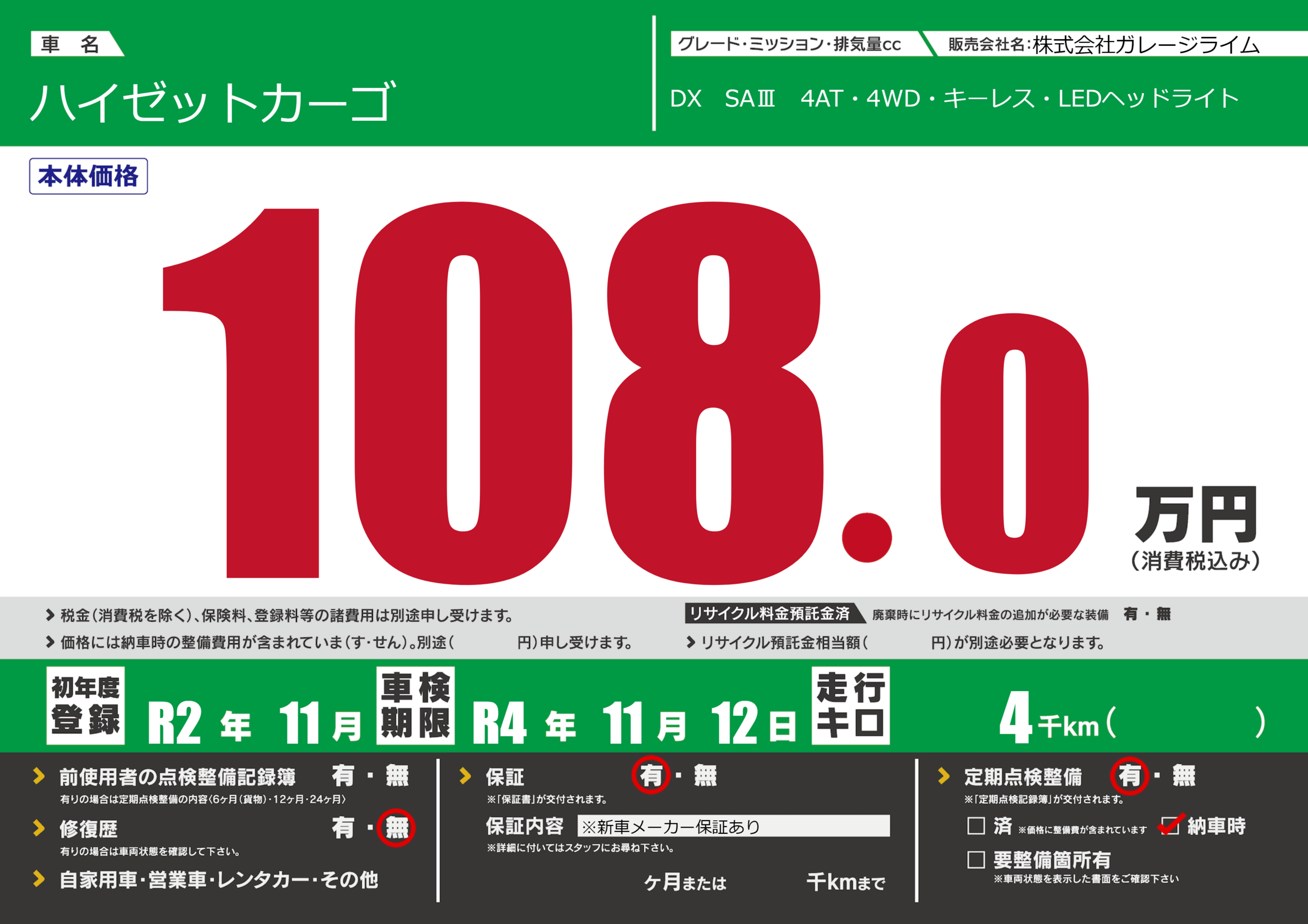 | 車名 | ハイゼットカーゴ | グレード ミッション 排気量 |