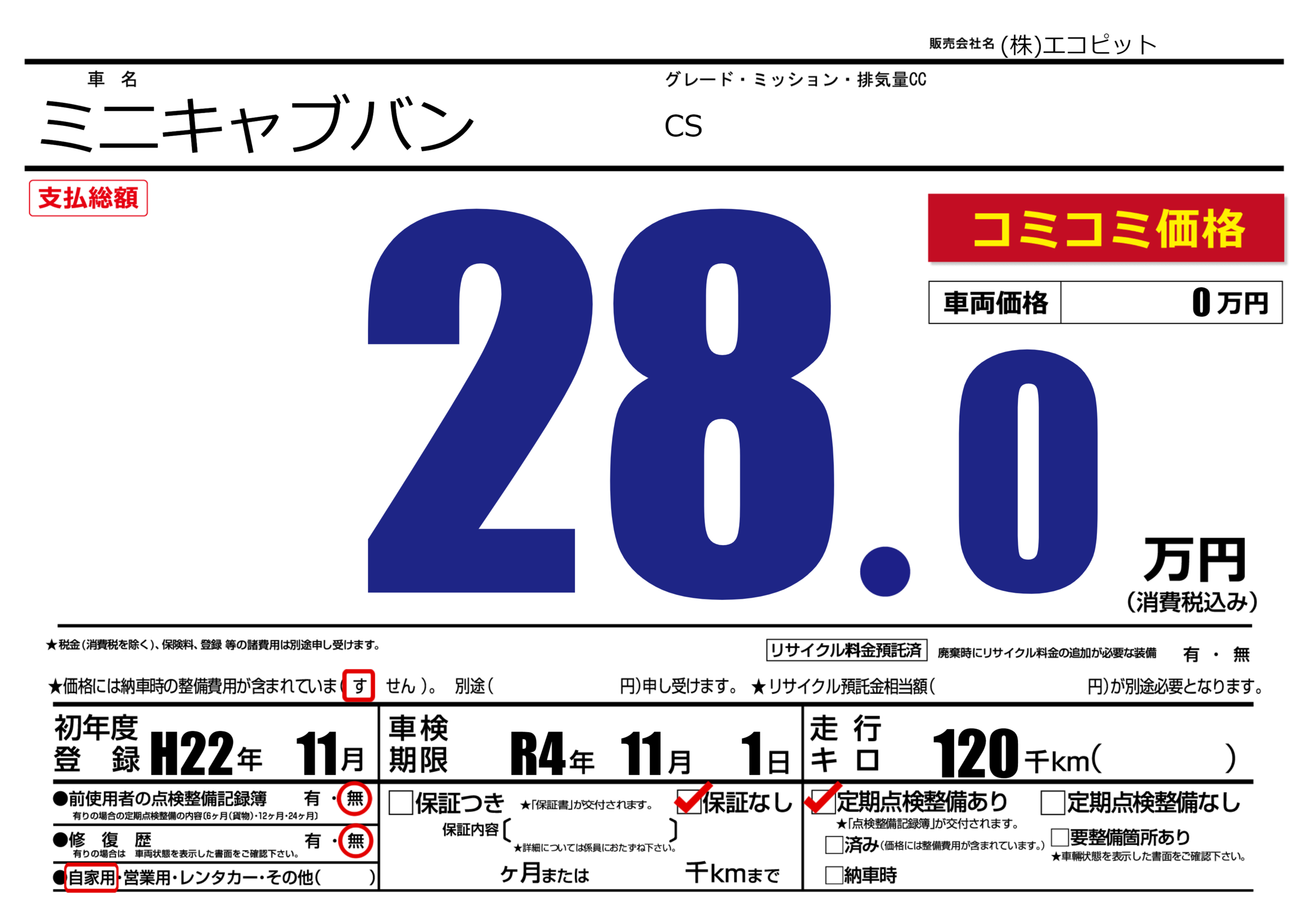 | 走行キロ | 12万km | 初年度登録 | H22年11月 |