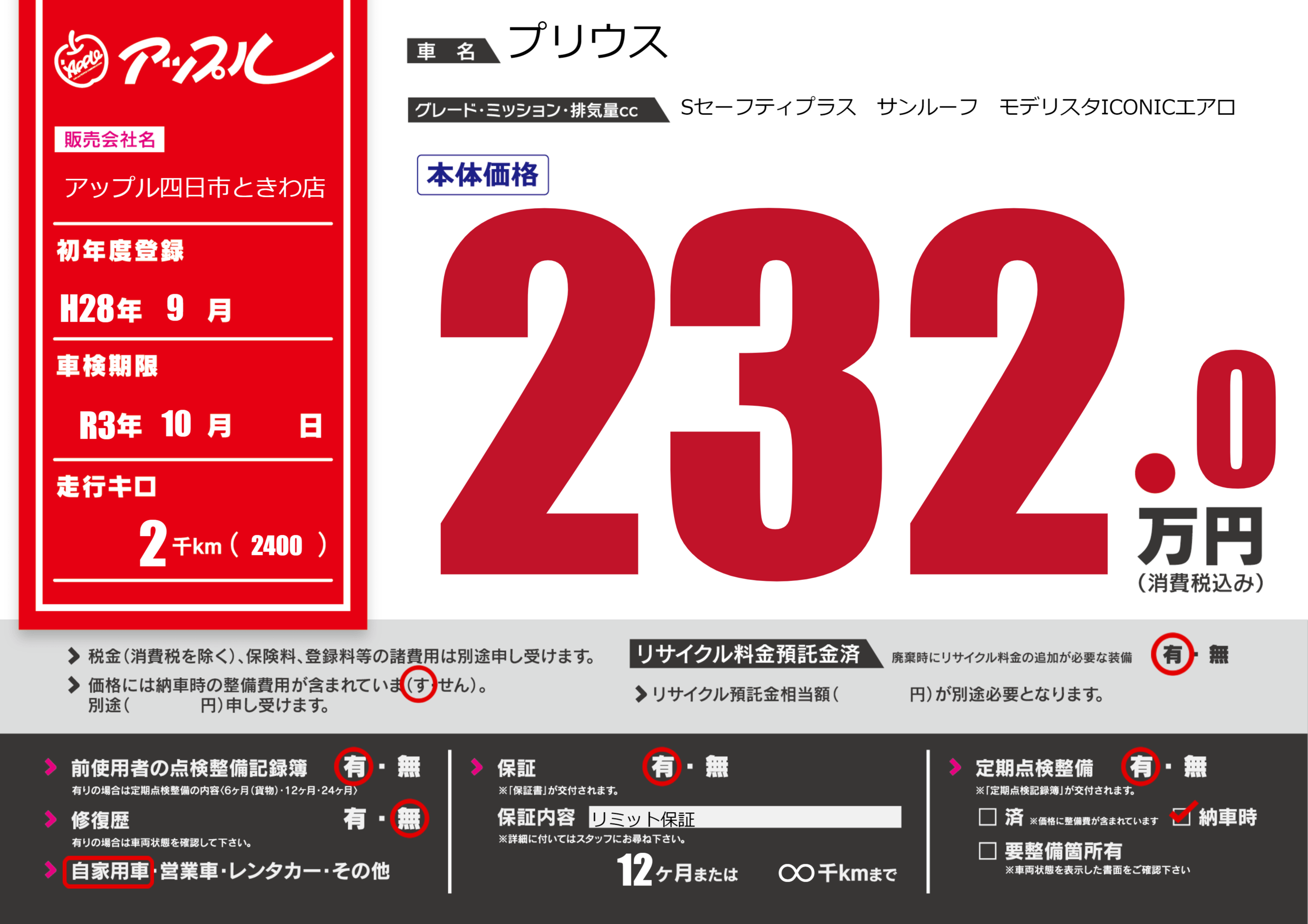 | 車名 | プリウス | グレード ミッション 排気量 |
