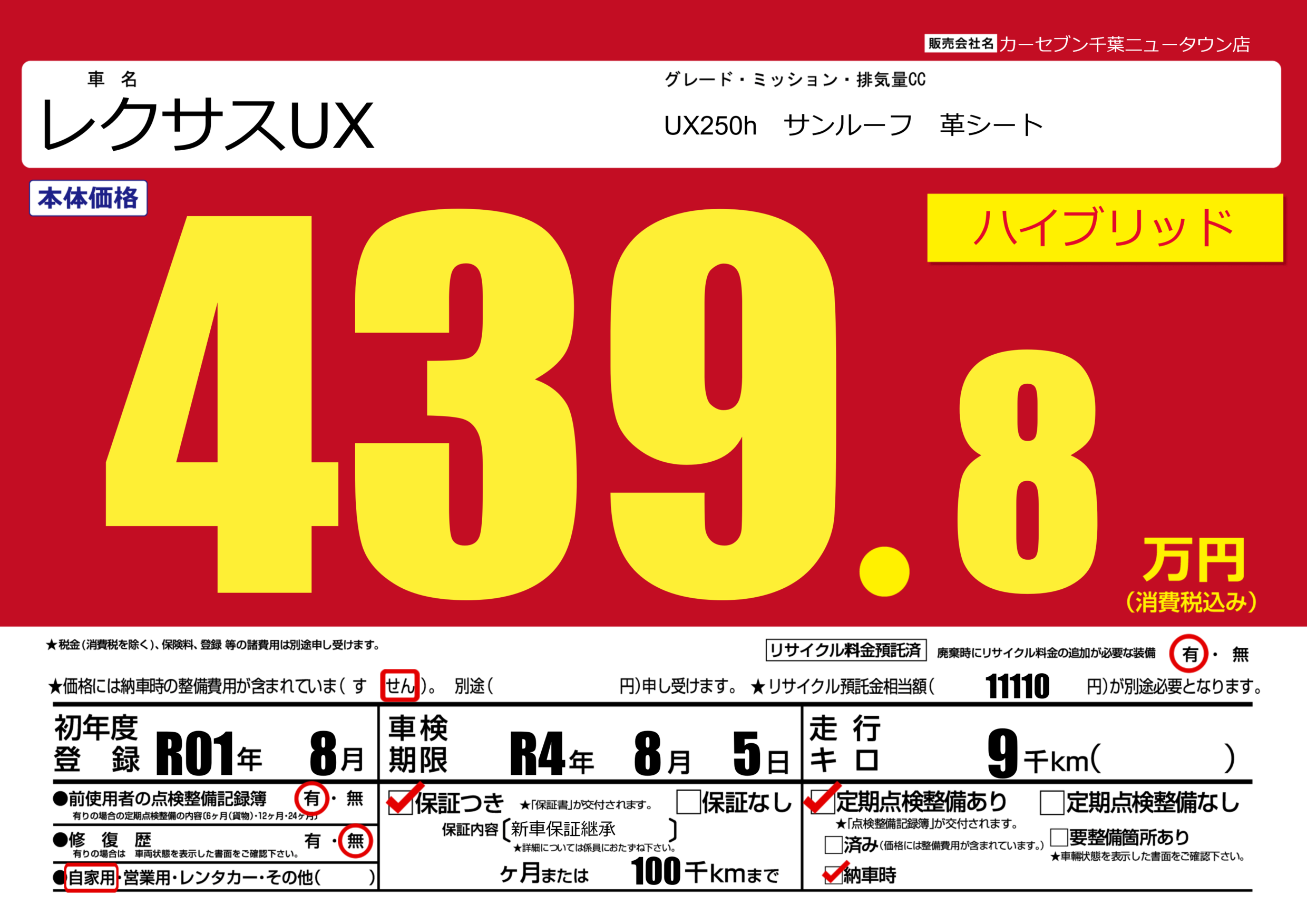 | 車名 | レクサスUX | グレード ミッション 排気量 |