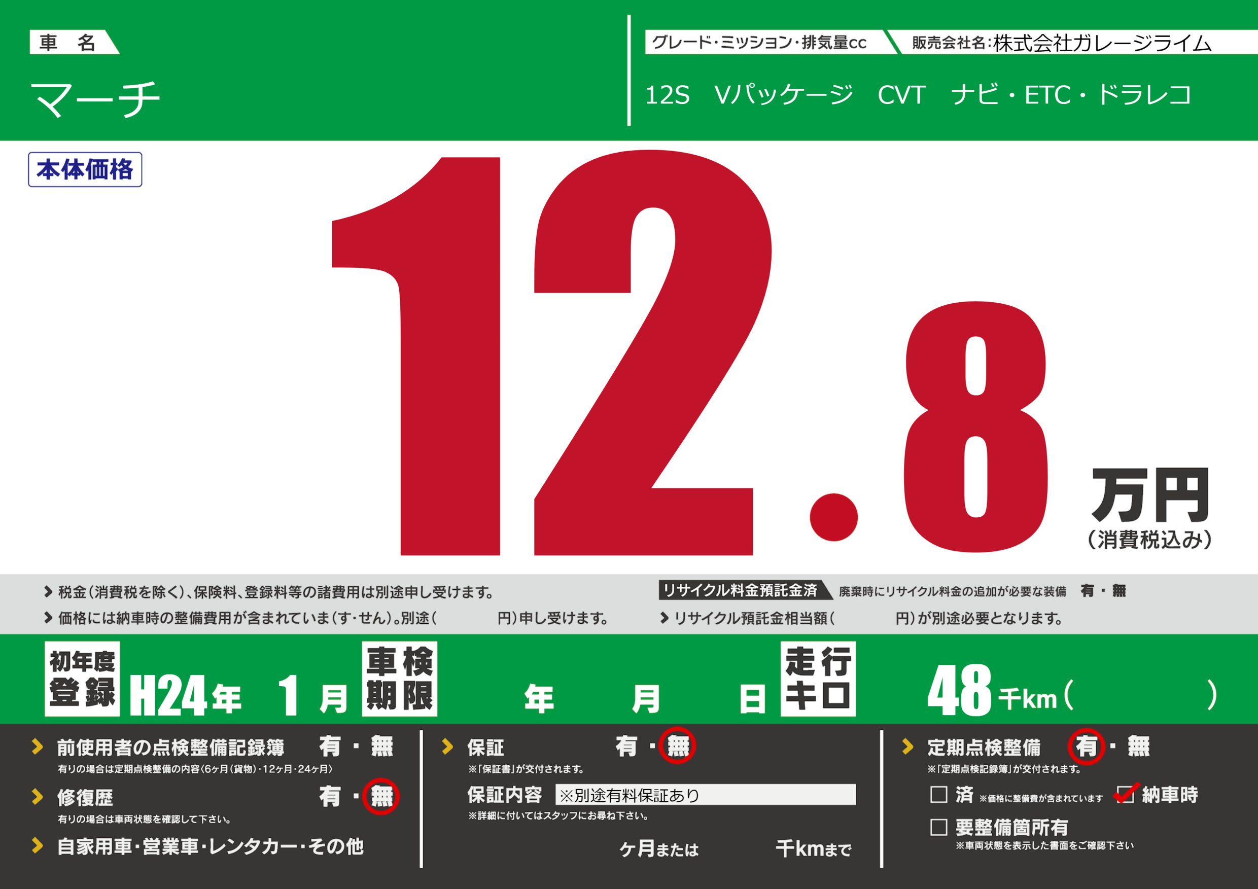 | 定期点検整備 | 定期点検整備あり 納車時あり | ||