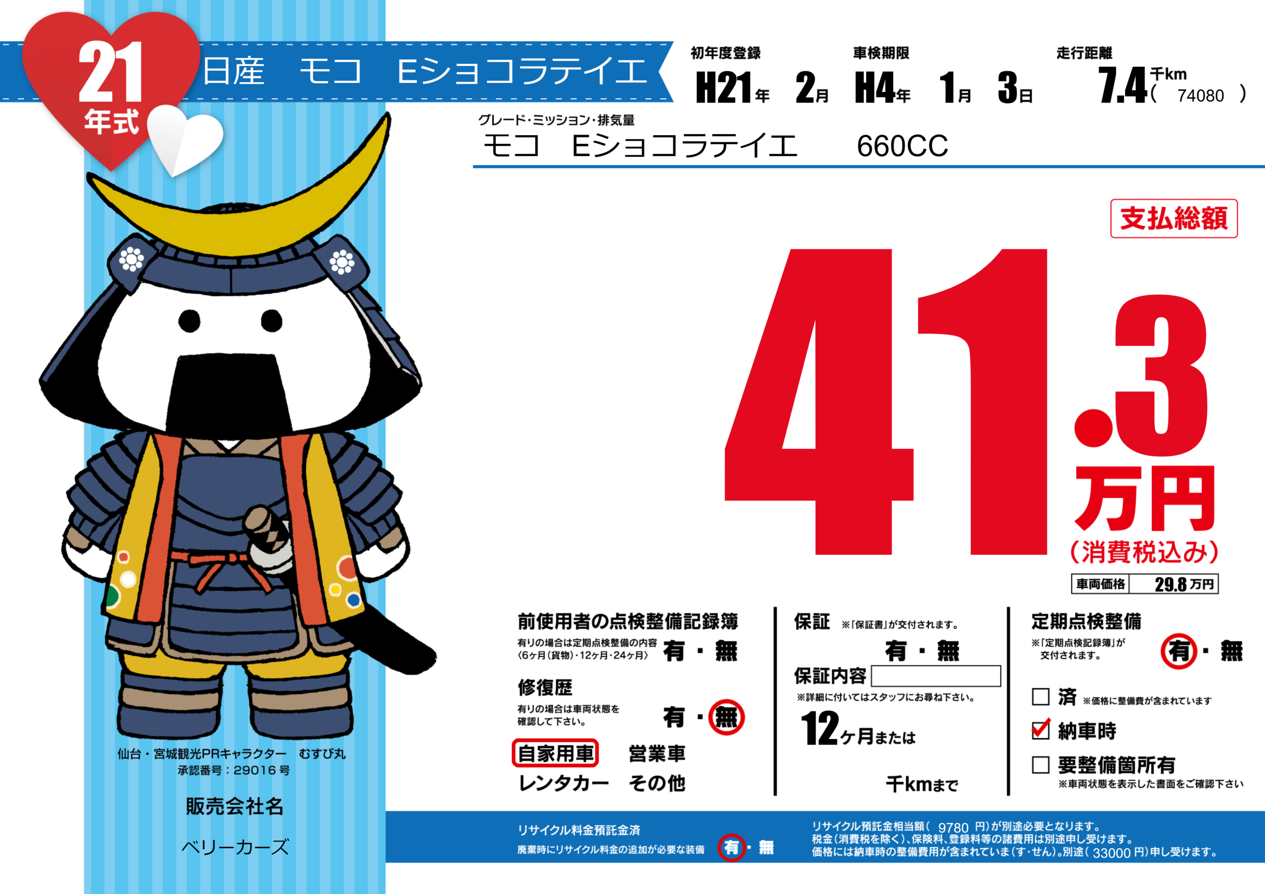 | 定期点検整備 | 定期点検整備あり 納車時あり | ||