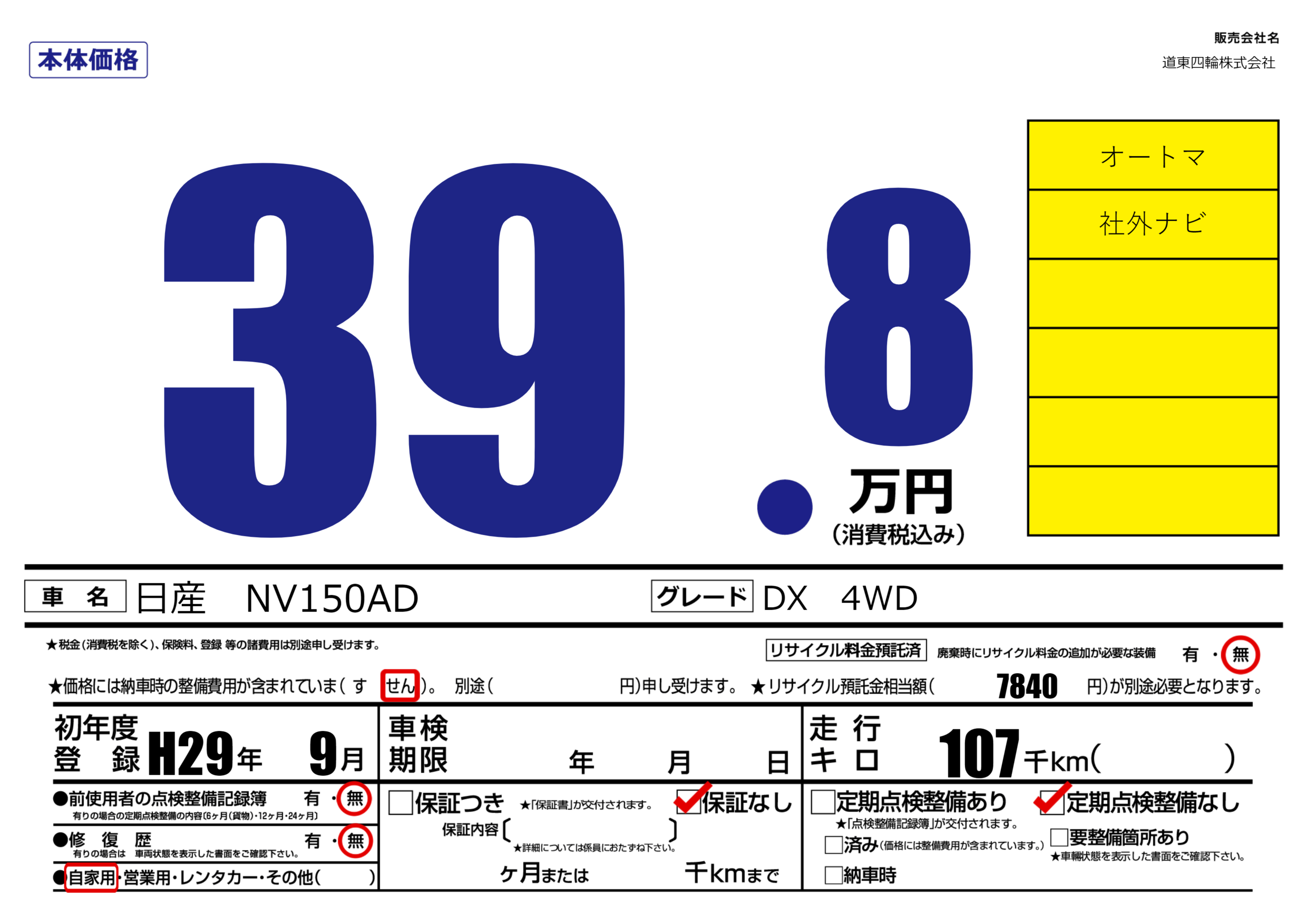 | 車名 | 日産 NV150AD | グレード ミッション 排気量 |