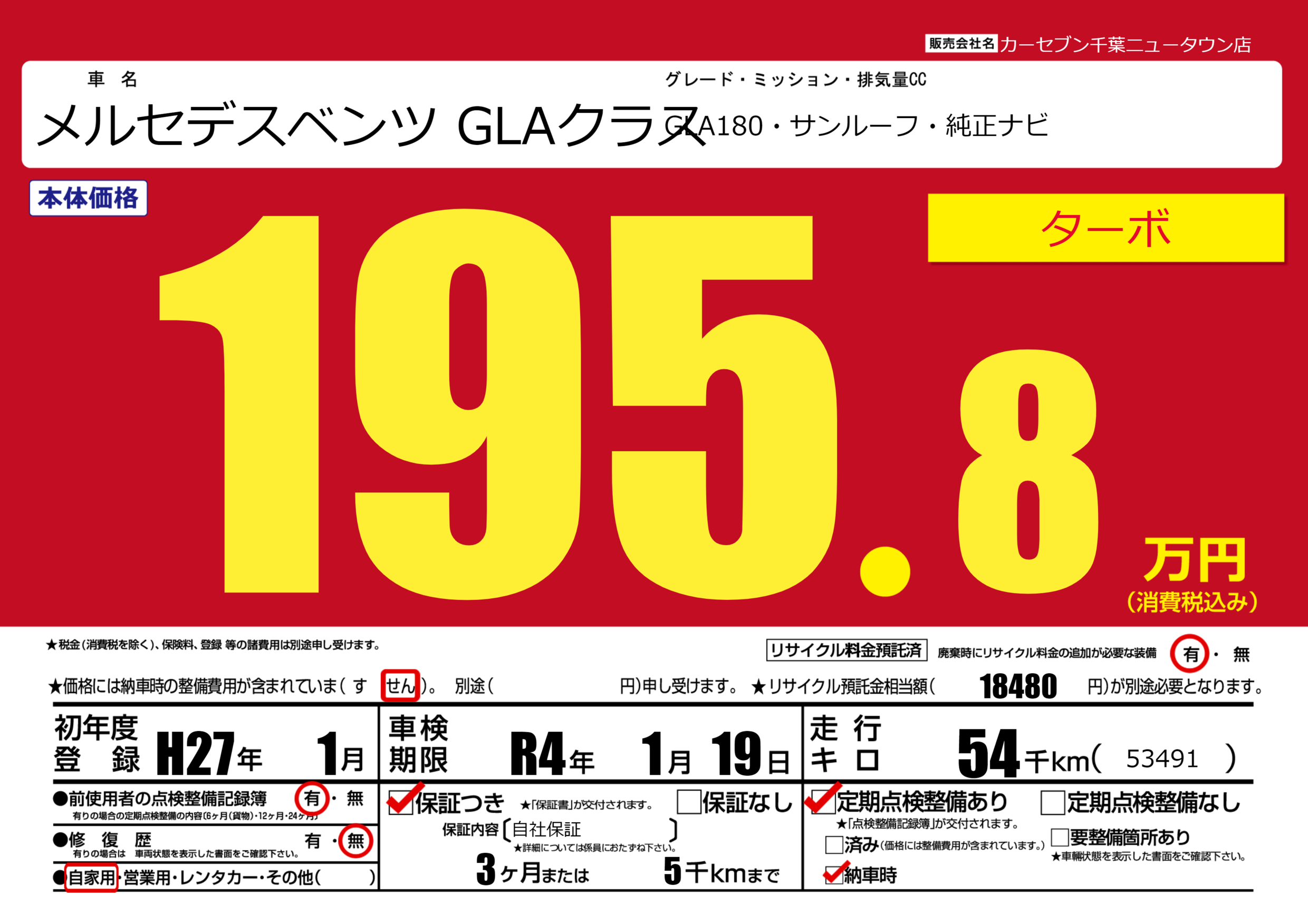 | 車名 | メルセデスベンツ GLAクラス | グレード ミッション 排気量 |