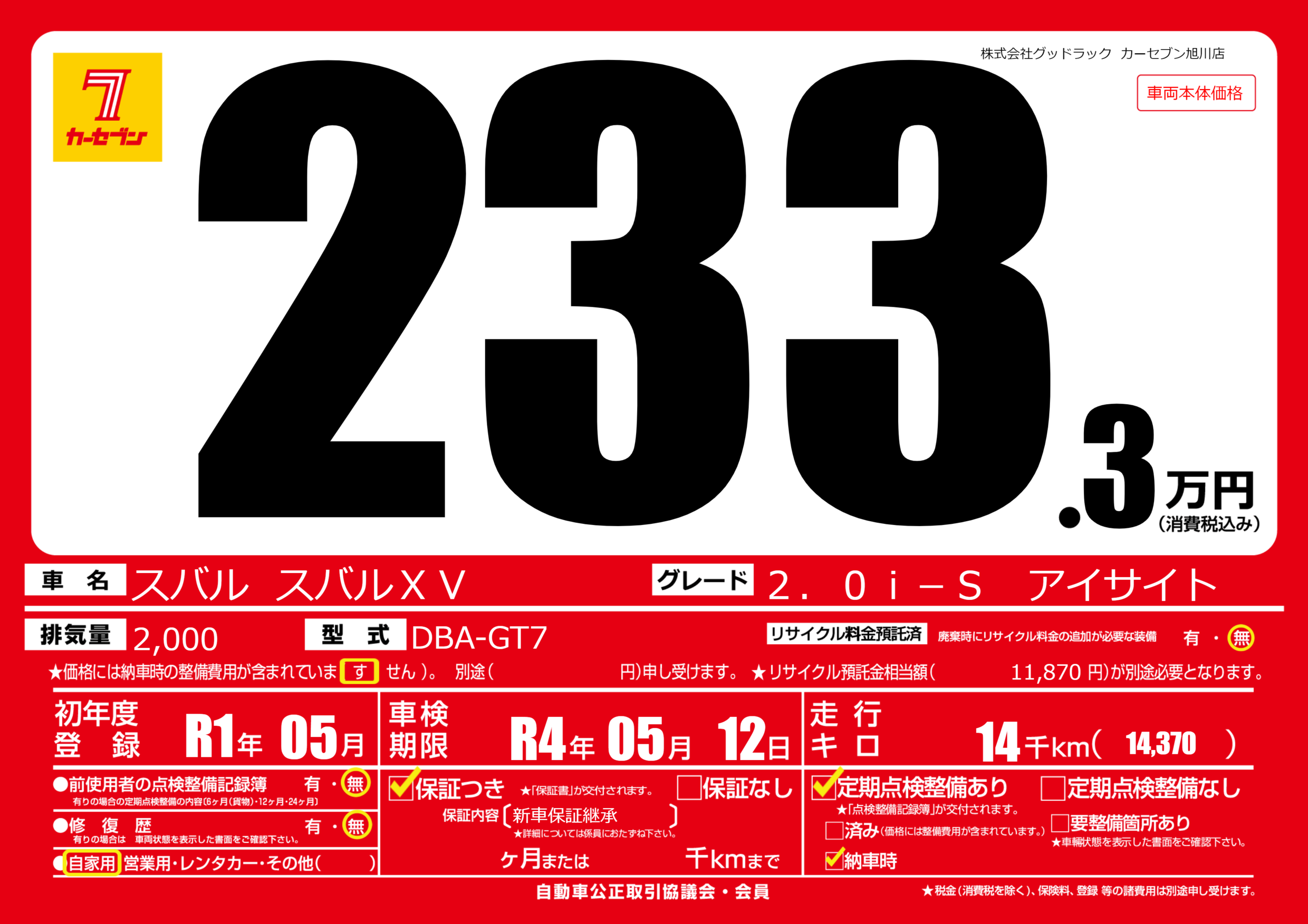 | 車名 | スバル スバルXV | グレード ミッション 排気量 |
