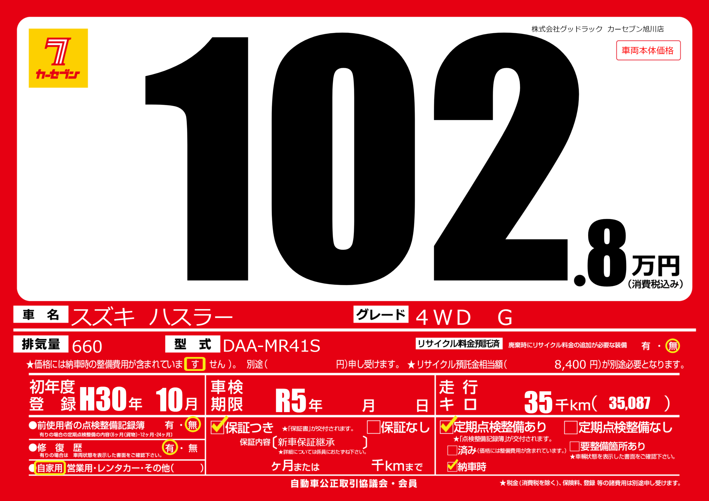 | 走行キロ | 3.5万km | 初年度登録 | H30年10月 |