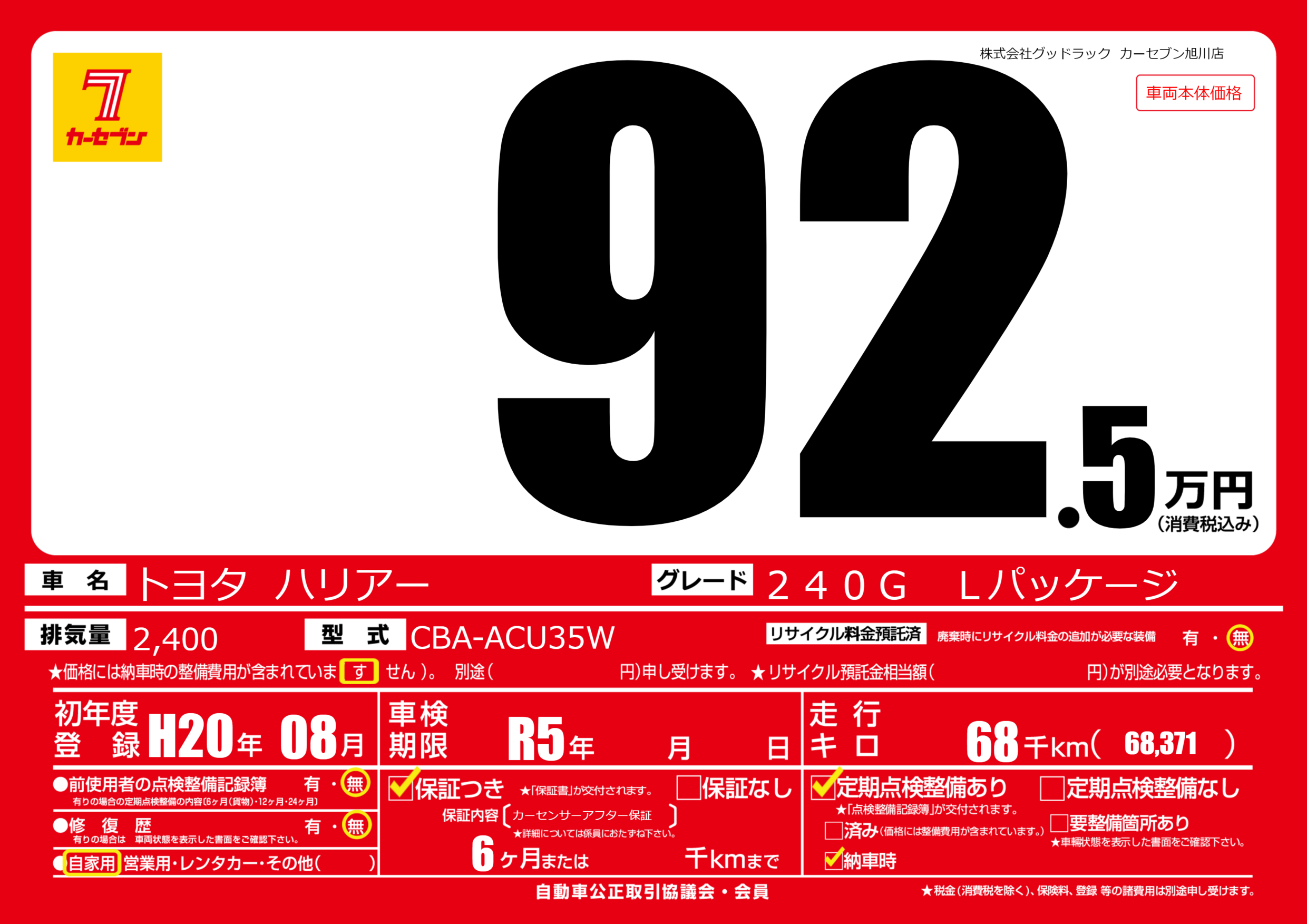 | 走行キロ | 6.8万km | 初年度登録 | H20年08月 |