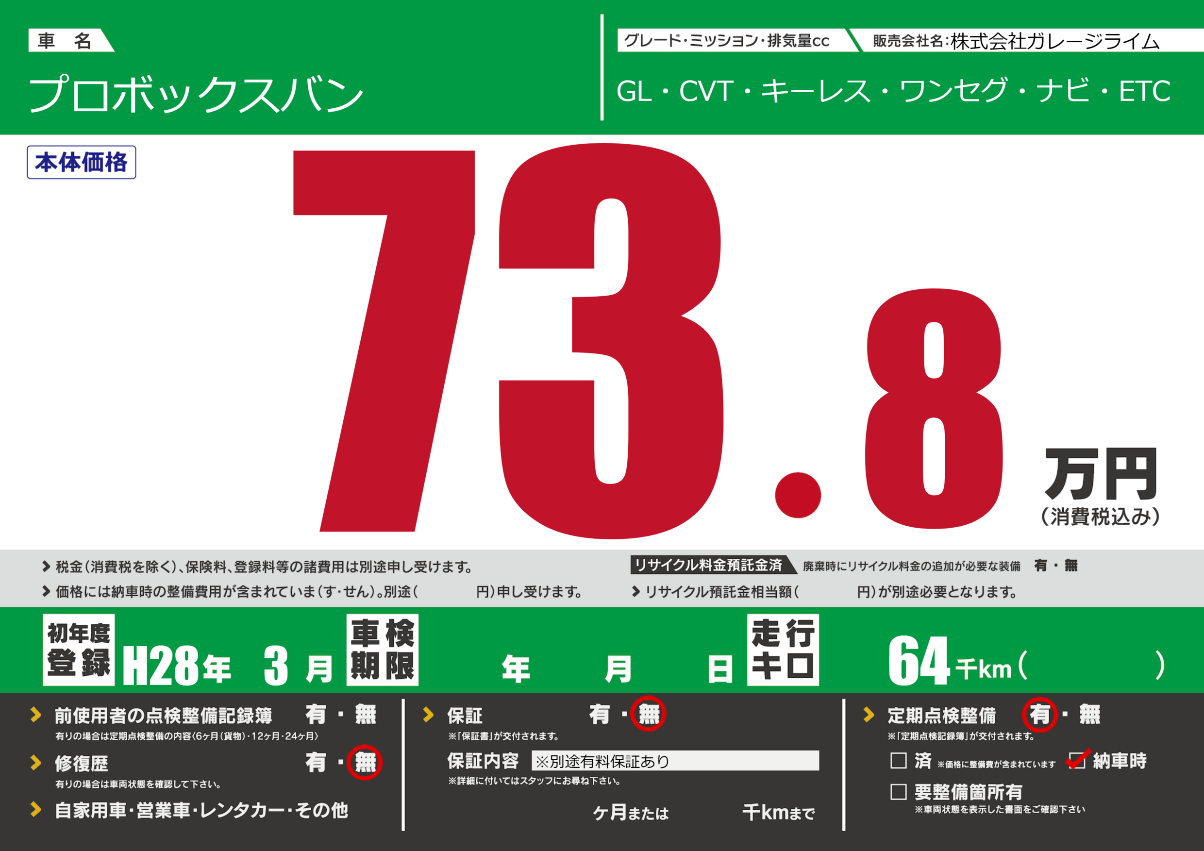 | 車名 | プロボックスバン | グレード ミッション 排気量 |