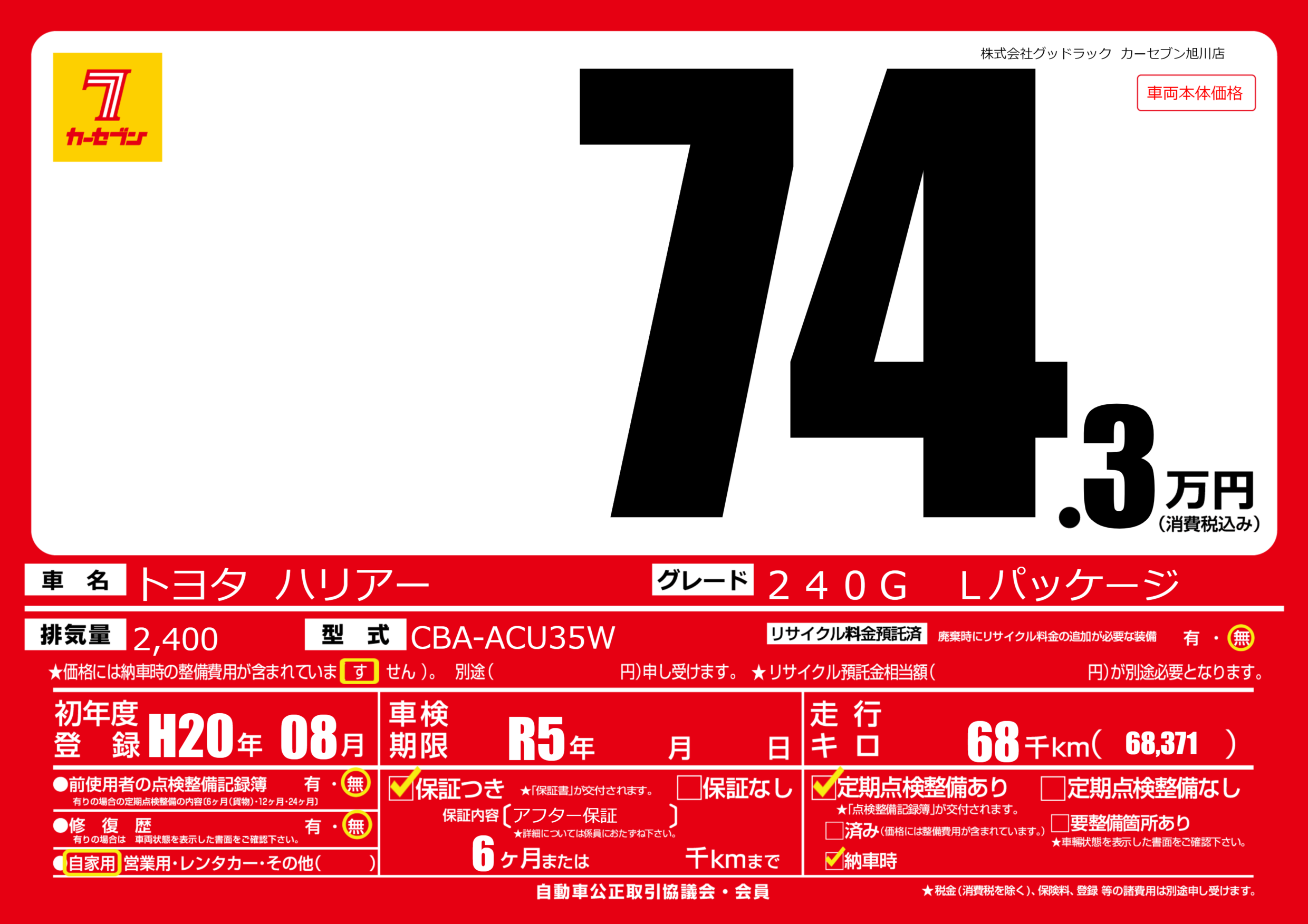 | 走行キロ | 6.8万km | 初年度登録 | H20年08月 |