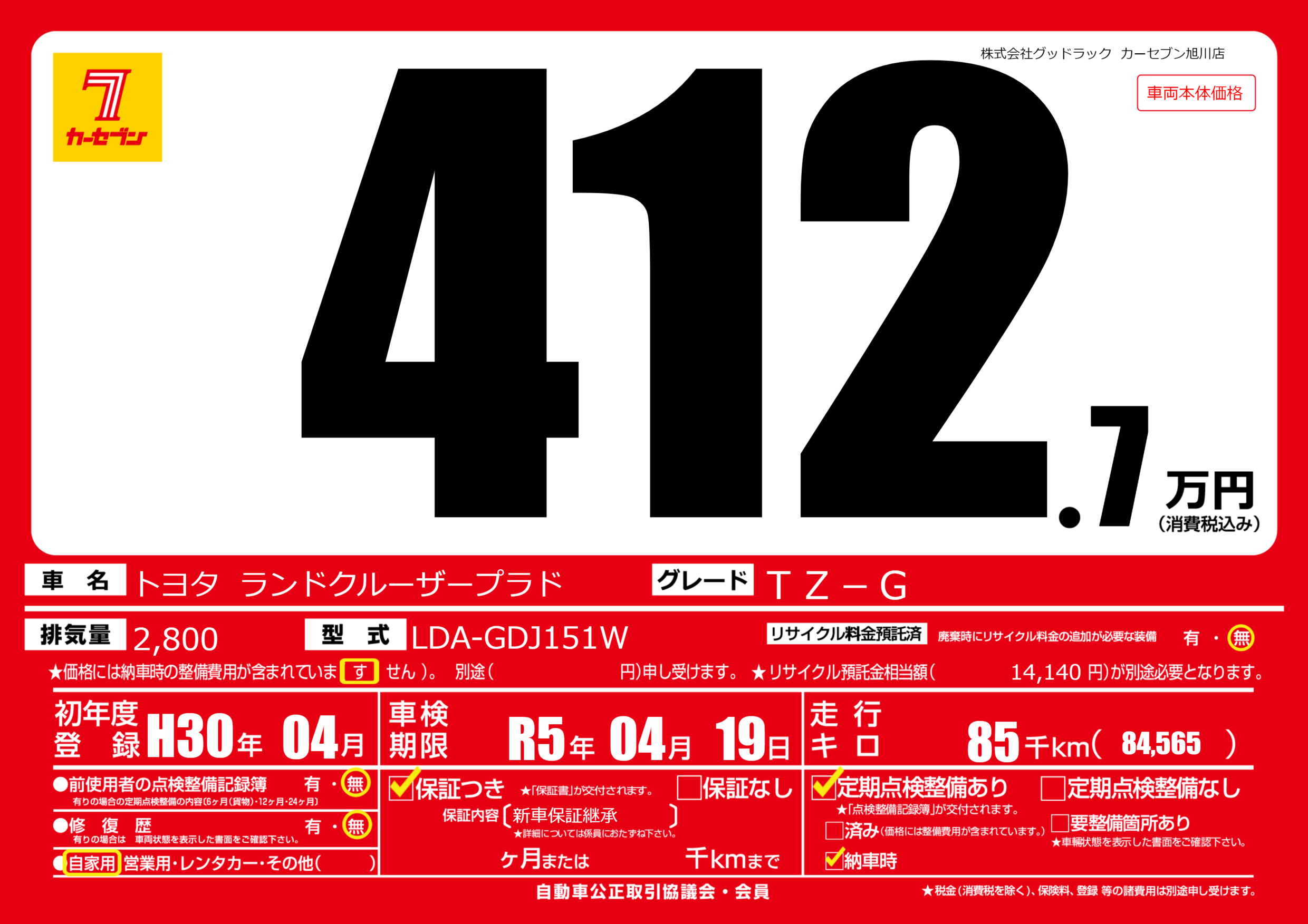 | 車名 | トヨタ ランドクルーザープラド | グレード ミッション 排気量 |