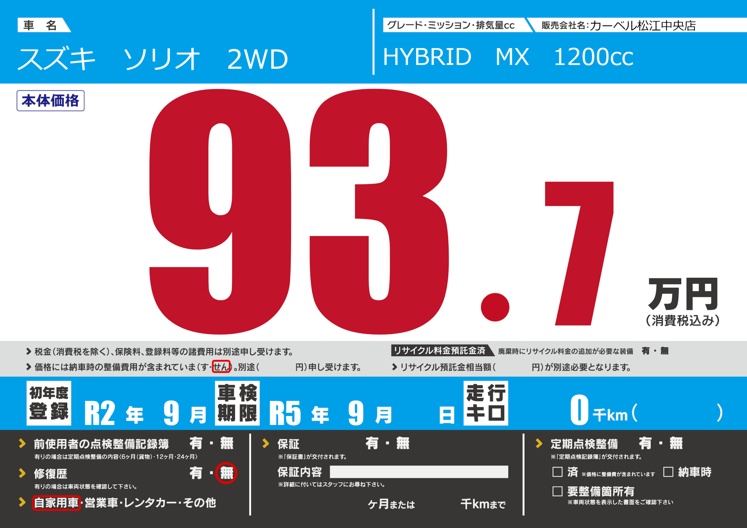 | 車名 | スズキ ソリオ 2WD | グレード ミッション 排気量 |