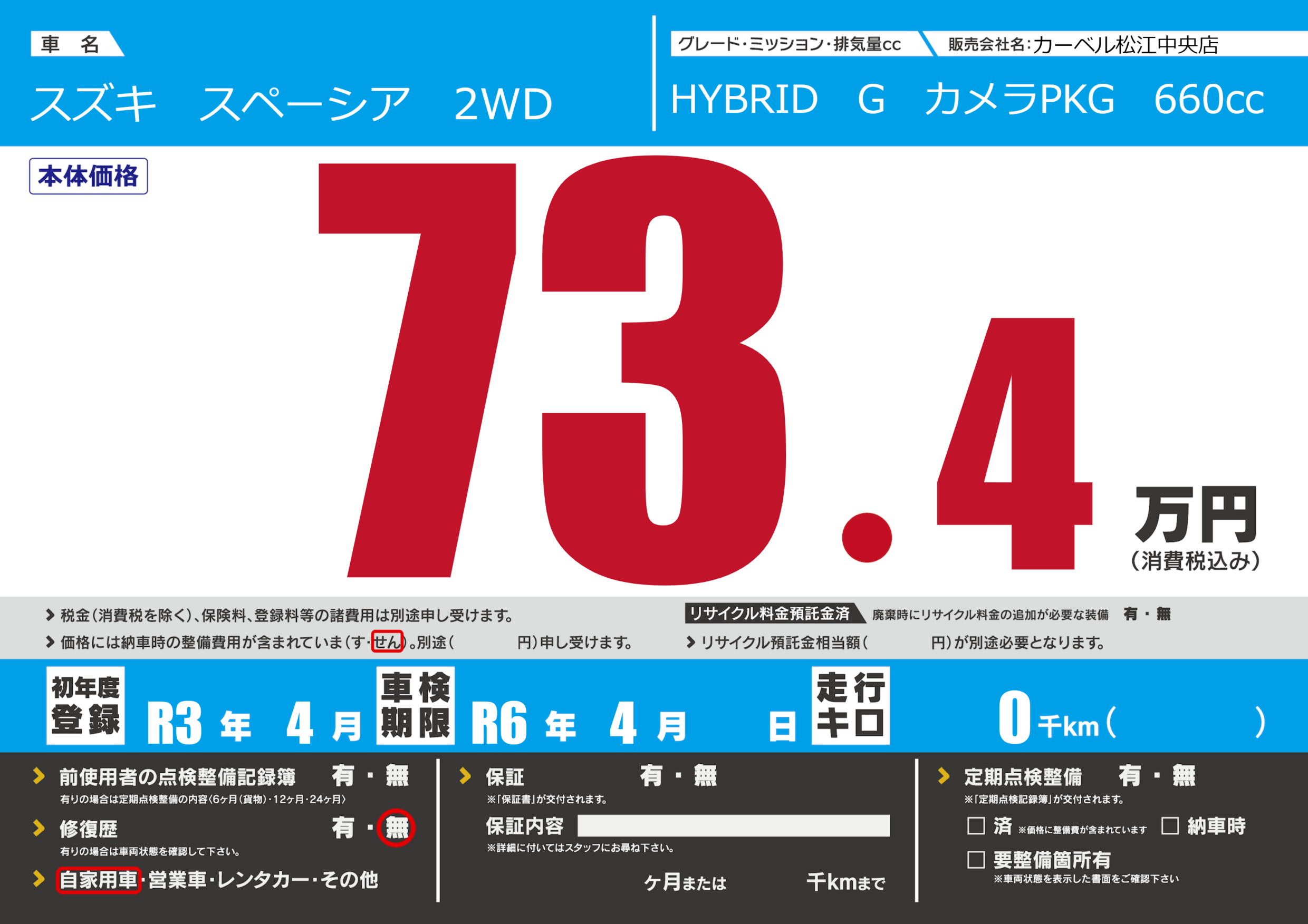 | 車名 | スズキ スペーシア 2WD | グレード ミッション 排気量 |
