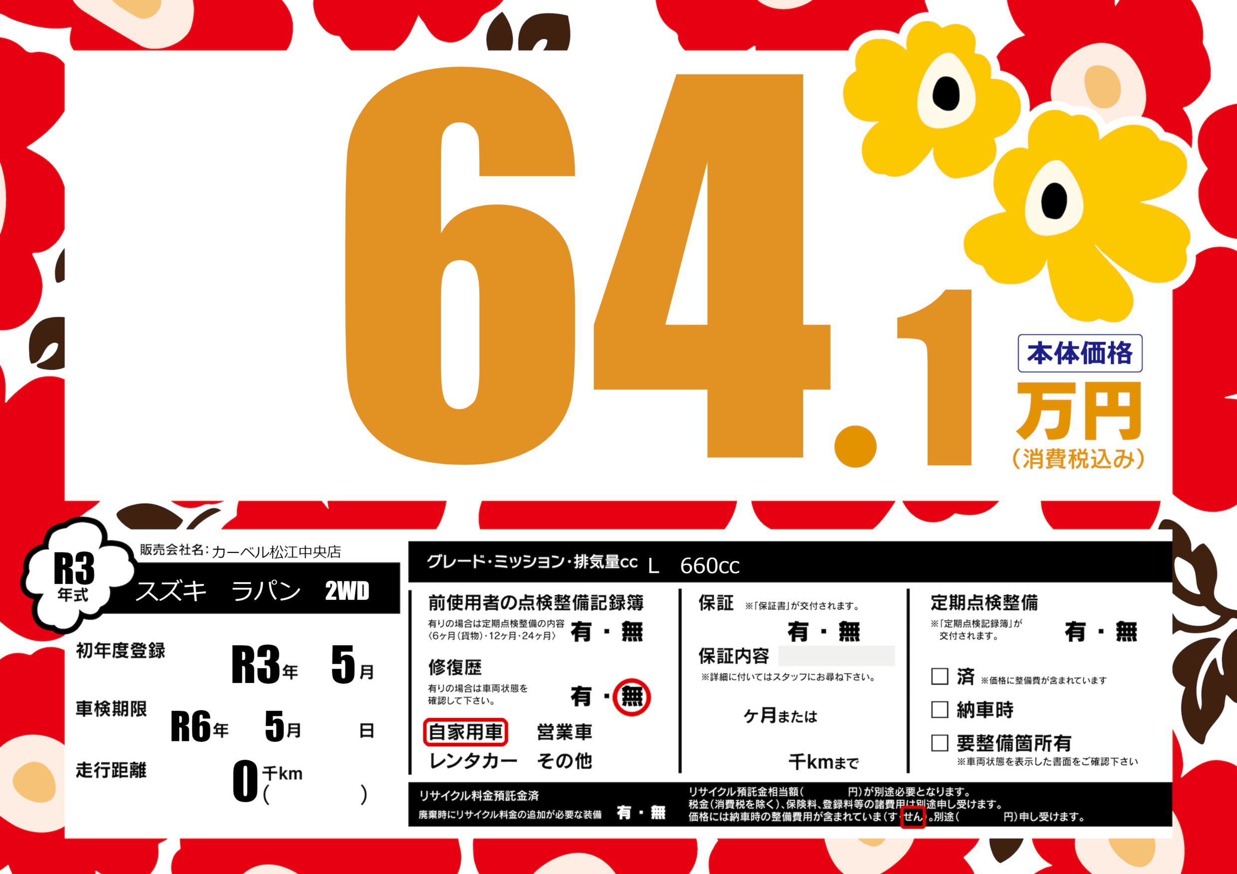 | 車名 | スズキ ラパン 2WD | グレード ミッション 排気量 |