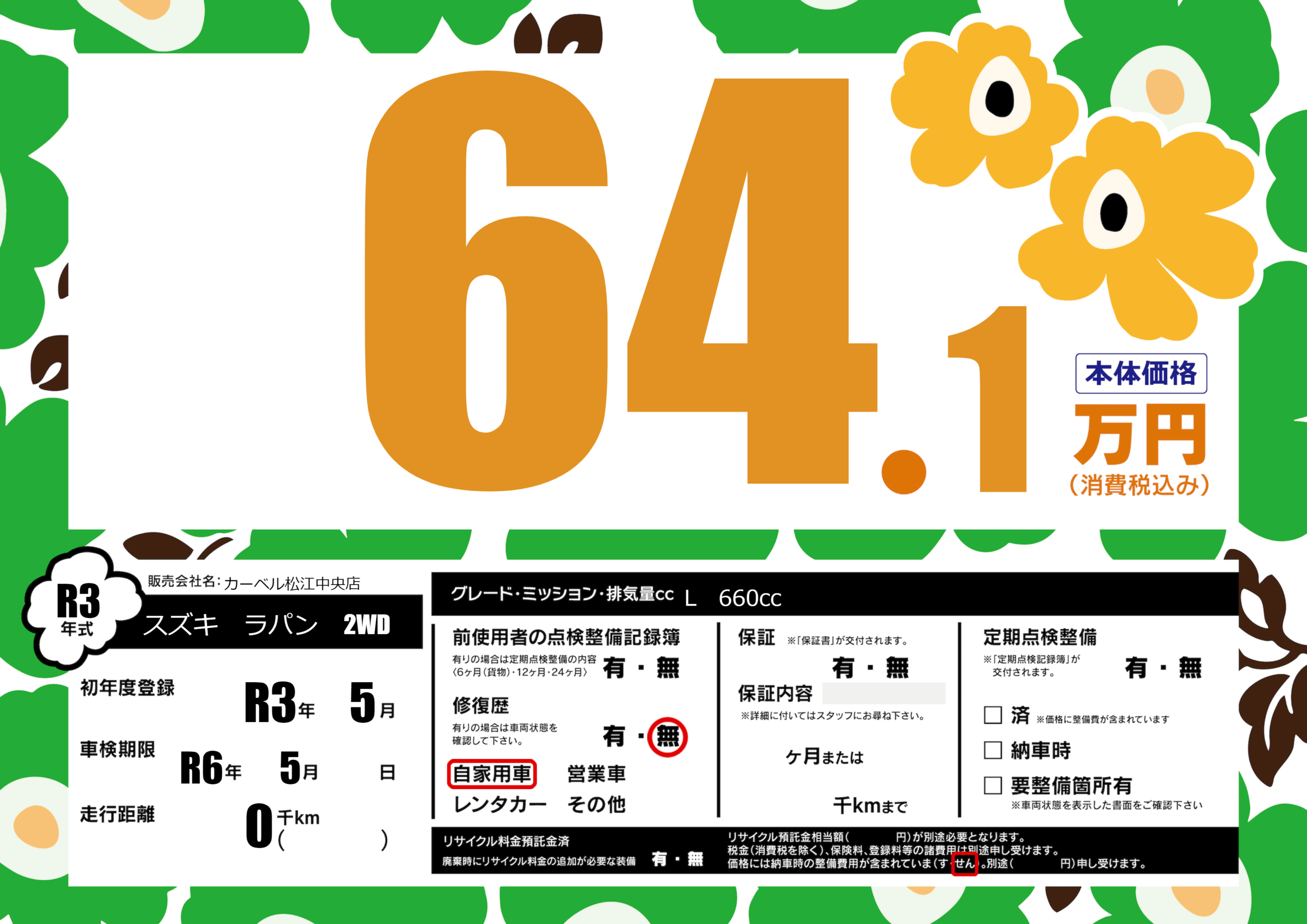 | 車名 | スズキ ラパン 2WD | グレード ミッション 排気量 |